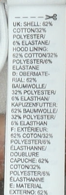 - Material Breakdown: 62% Cotton 32% Polyester 6% Elastane