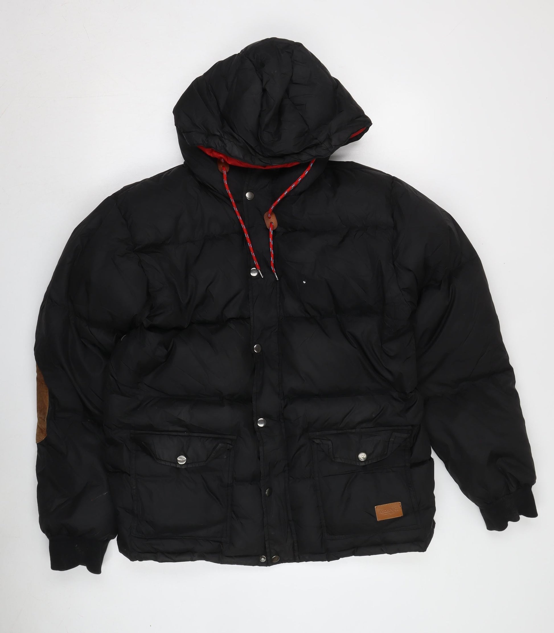 Akomplice Men's Black Puffer Jacket, L, Hooded, Snap Closure