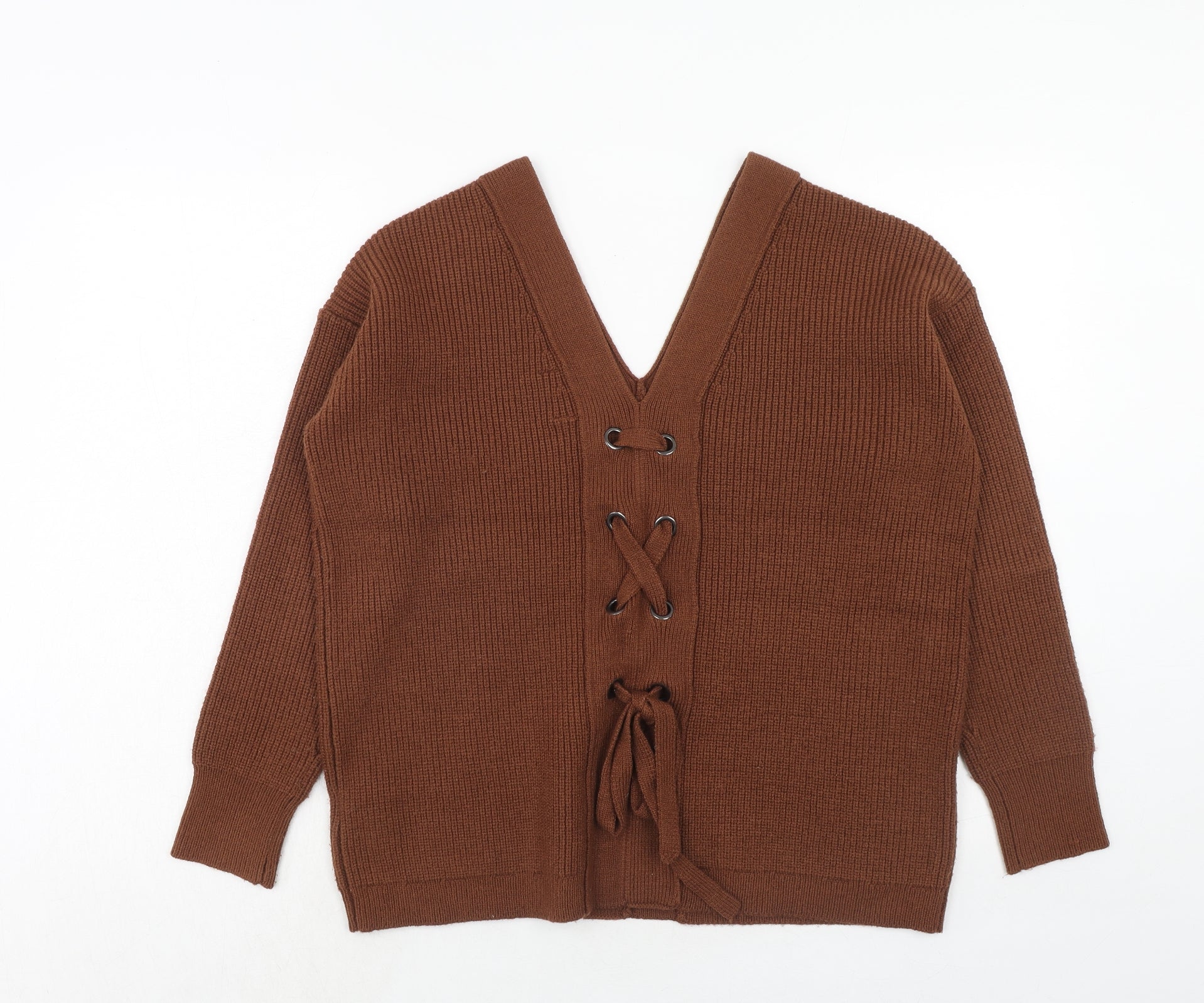 Apricot Womens Brown V-Neck Polyester Pullover Jumper Size 10 - Lace Up Back