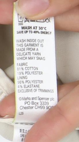 - Material Breakdown: 81% Polyester 19% Cotton 4% Elastane