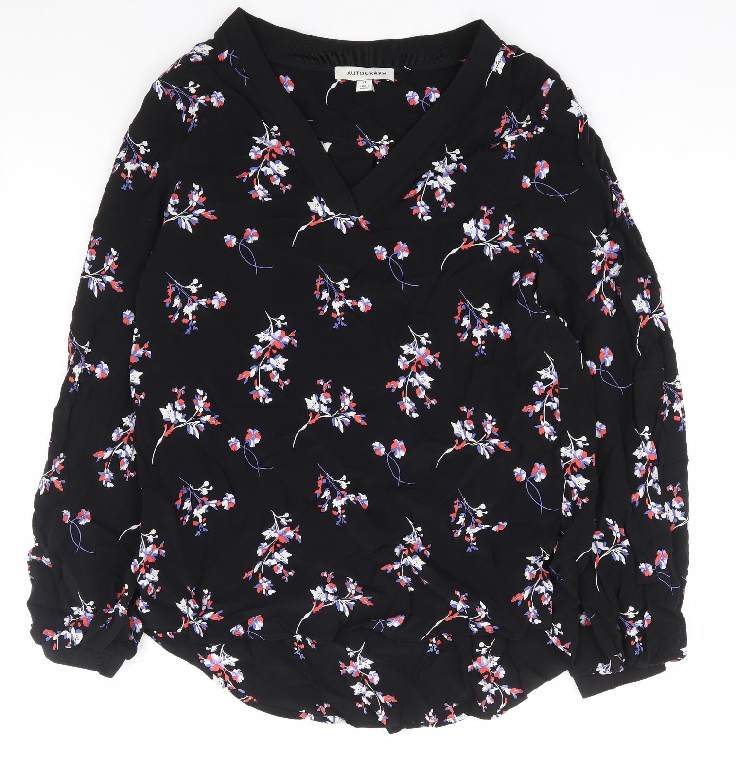Autograph Womens Black Floral Viscose Basic Blouse Size 8 V-Neck