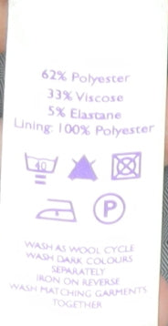 - Material Breakdown: 62% Polyester 33% Viscose 5% Elastane