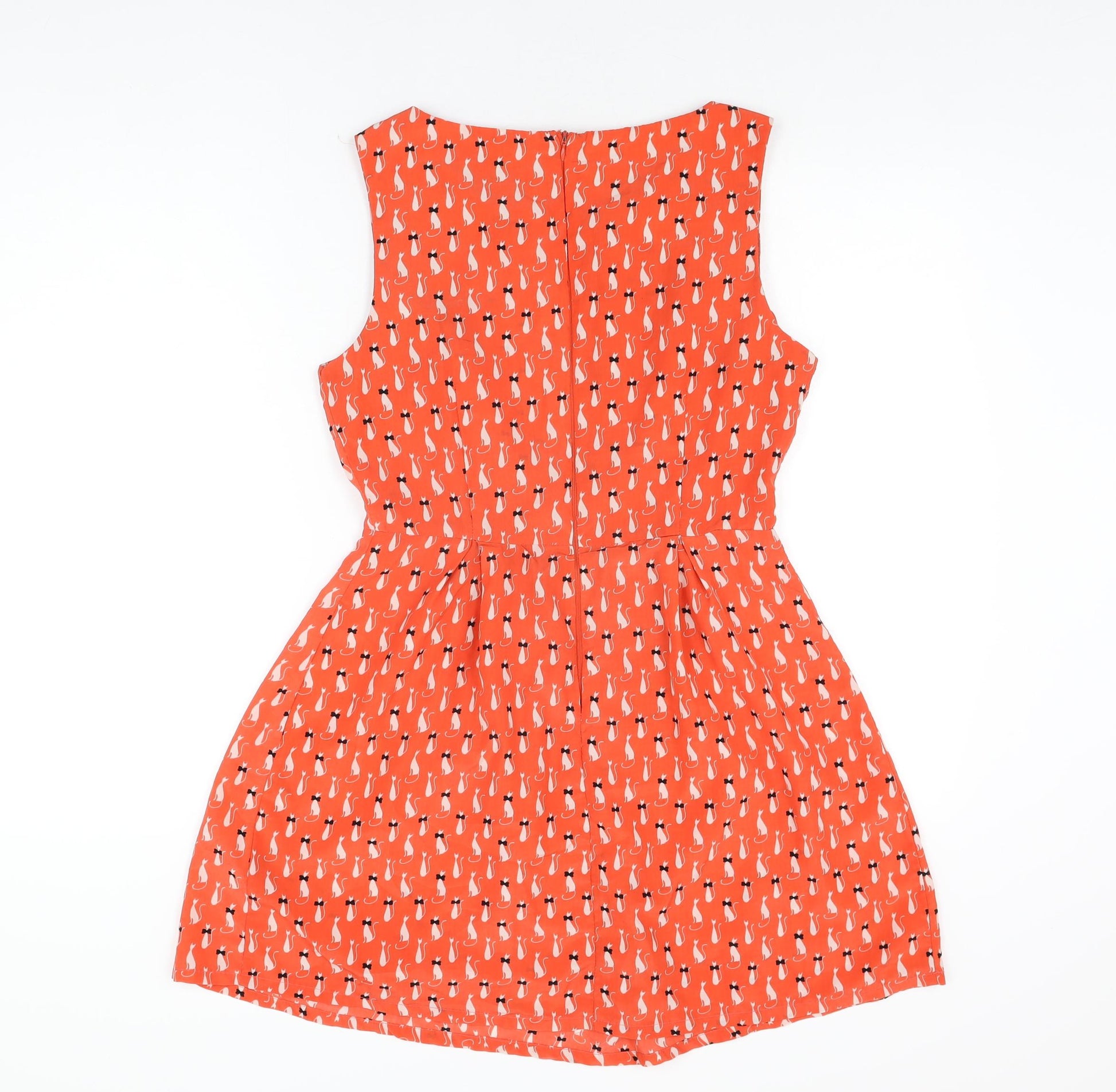 AX Paris Womens Red Geometric Polyester Skater Dress Size 10 Boat Neck Zip - Cat Print
