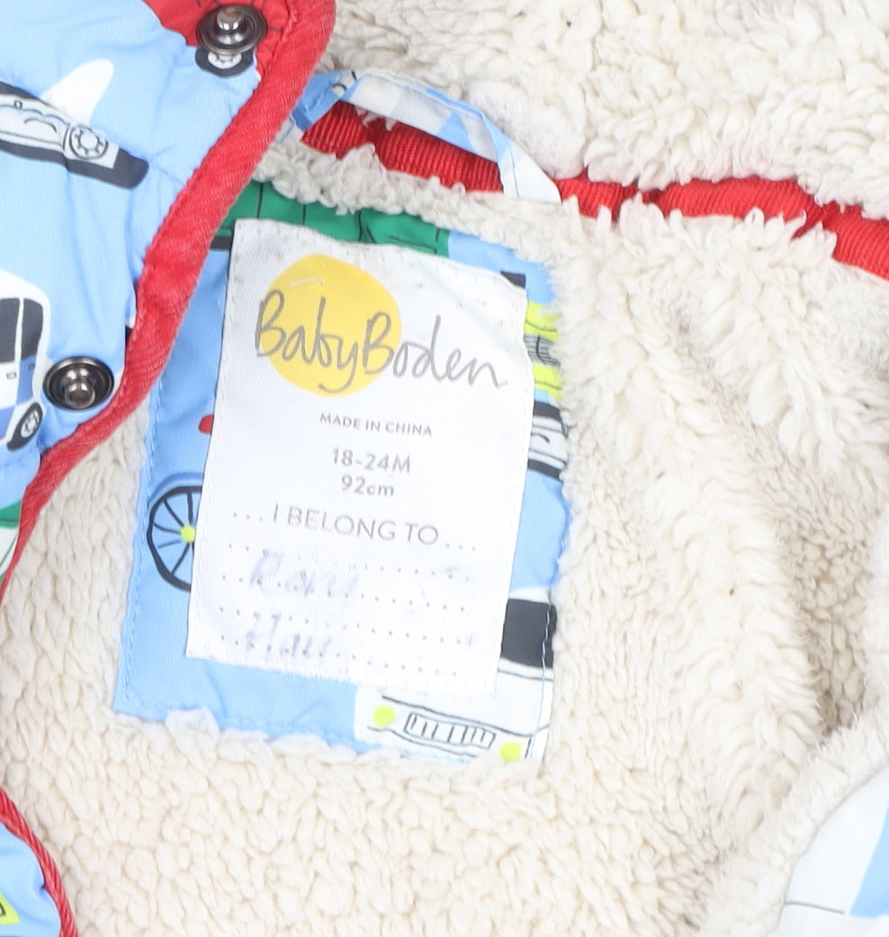 Baby Boden Blue Car Print Hooded Puffer Jacket 18-24 Months Polyester Lined