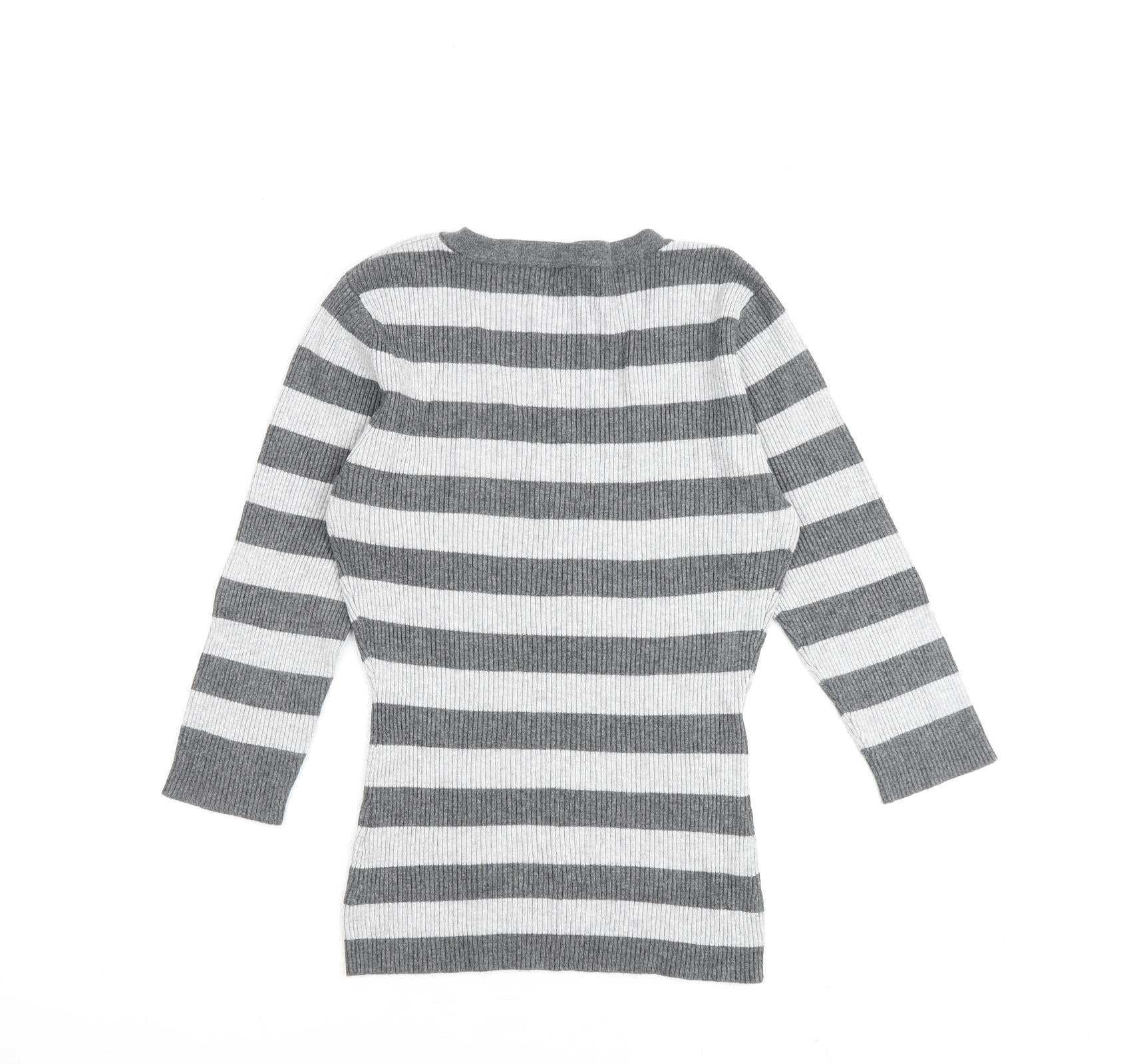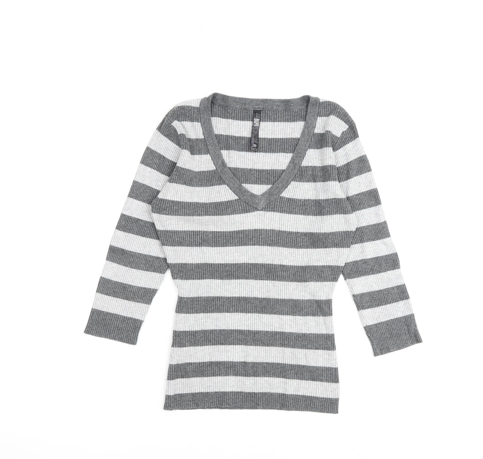 Bay Womens Grey V-Neck Striped Viscose Pullover Jumper Size 10