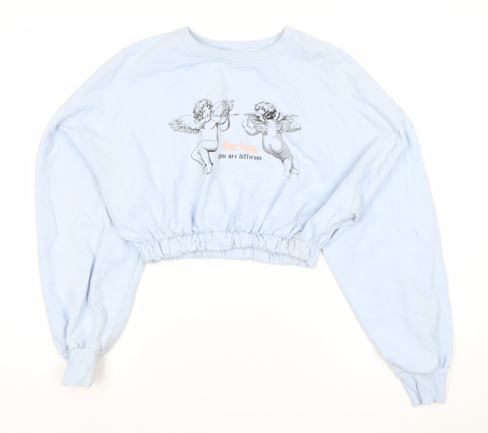 Bershka Womens Blue Crop Sweatshirt M Cupid Print Pullover