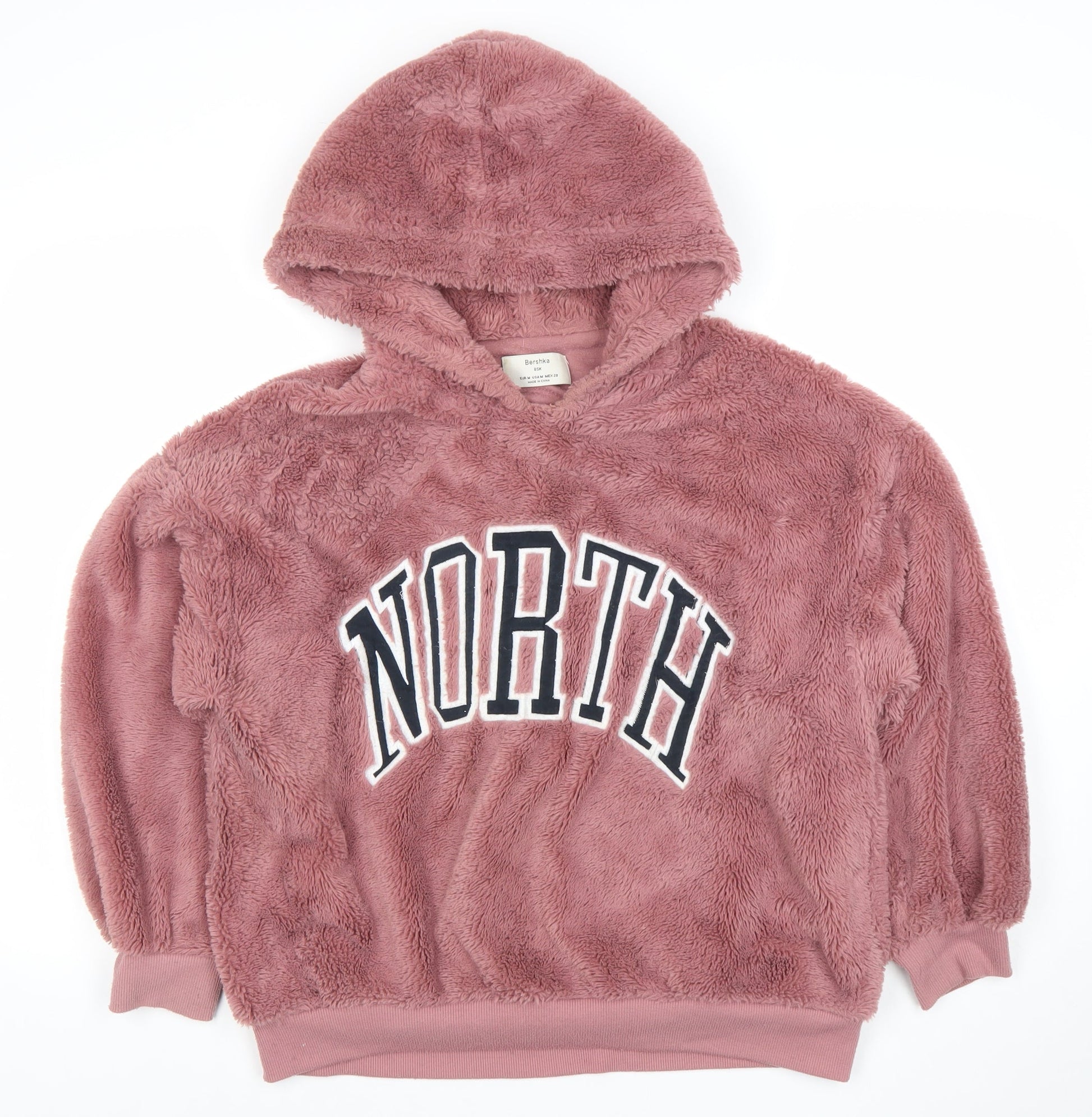 Bershka Women's Pink Fleece Pullover Hoodie Size 12 'NORTH' Design