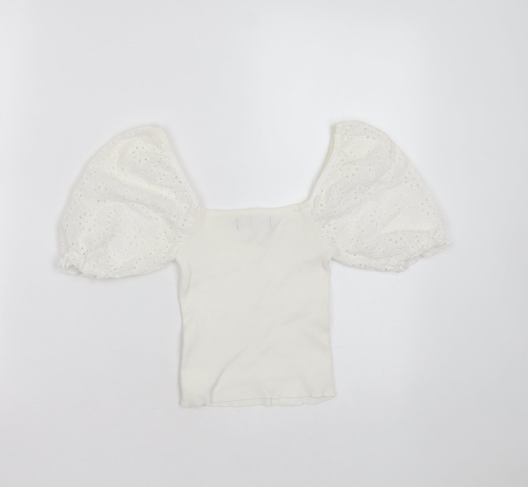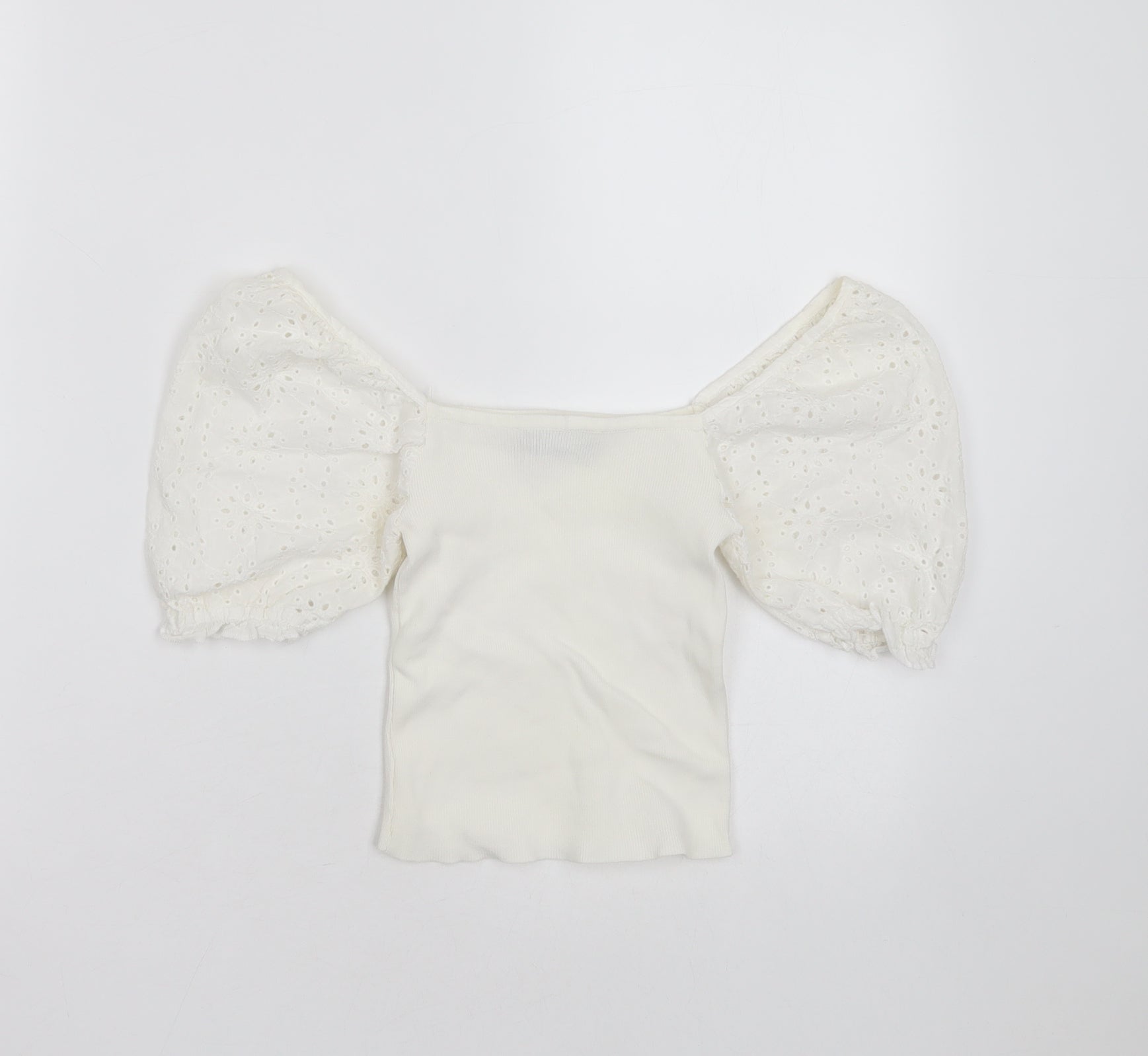 Bershka Womens White Polyester Blend Basic T-Shirt Size XS Square Neck - broderie sleeves