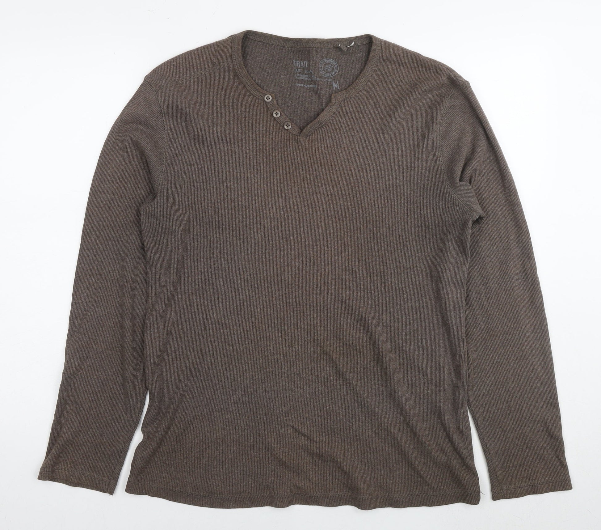 BHS Mens Brown V-Neck Cotton Pullover Jumper Size M Long Sleeve - Ribbed