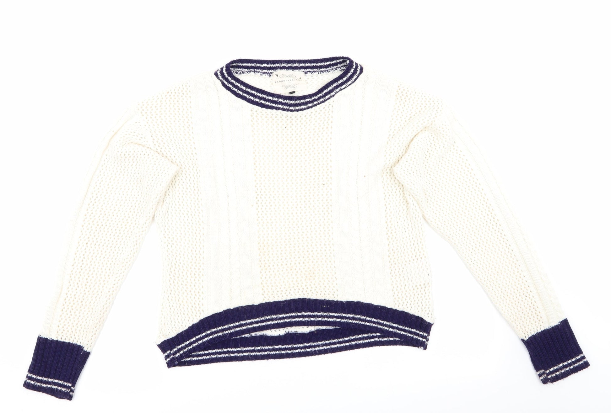 Blonde & Blonde Womens Ivory Pullover Jumper Size 14 - Cable & Open Knit Blue Neck Hem Cuff Trim