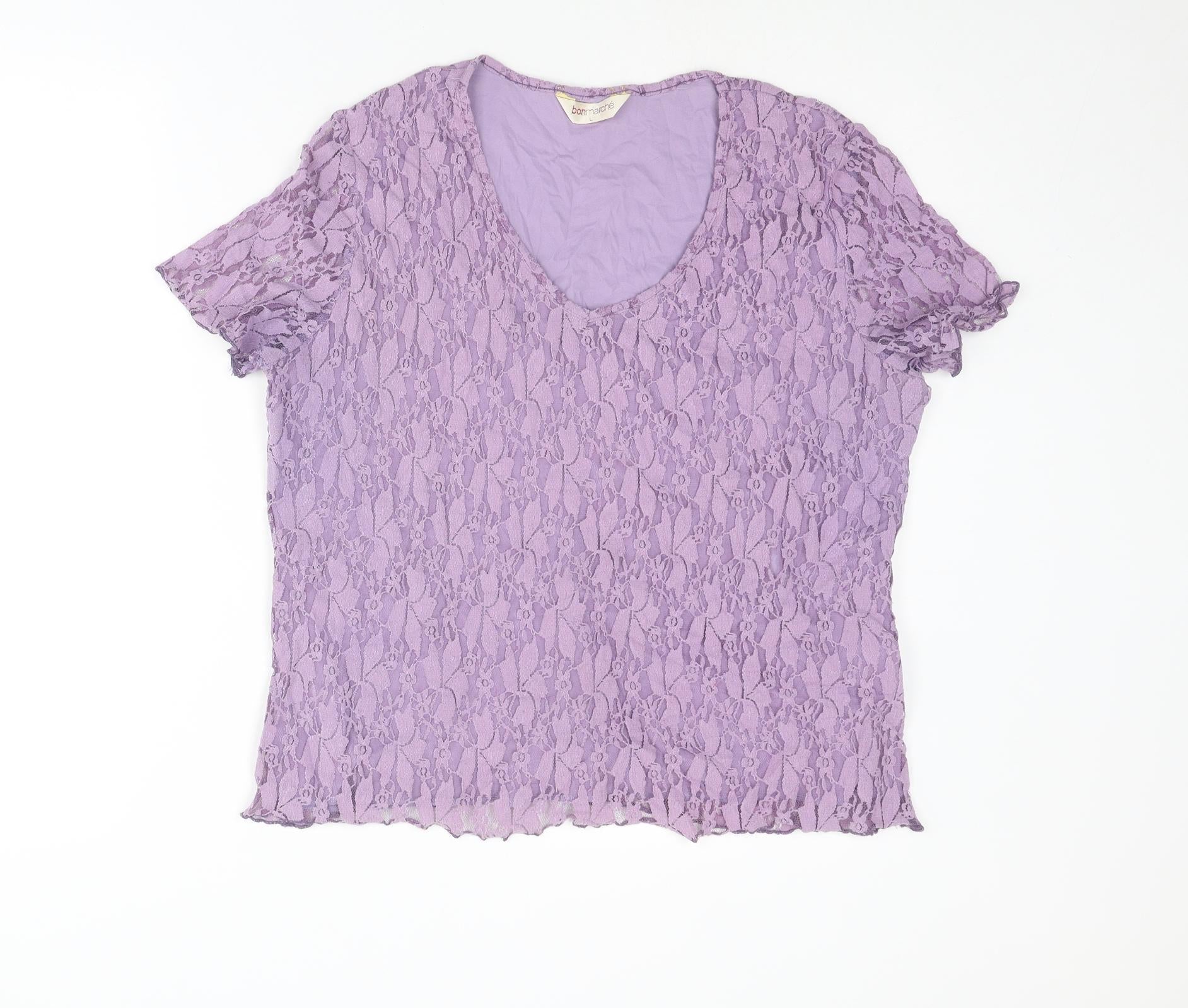 Bonmarché Womens Purple Geometric Nylon Basic T-Shirt Size L V-Neck