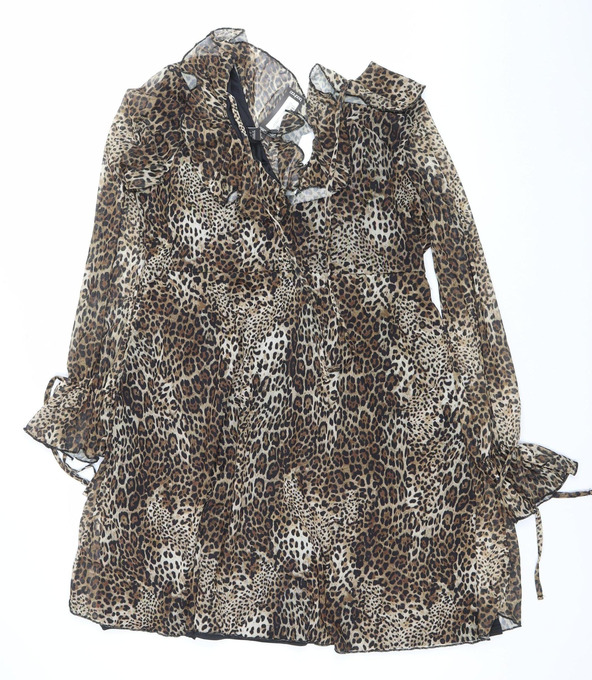 Boohoo Women Brown Leopard Print Wrap Dress Size 14 V-Neck Long Sleeve
