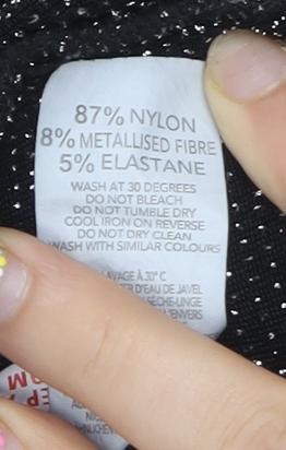 - Material Breakdown: 87% Nylon 8% Elastane 5% Metallic