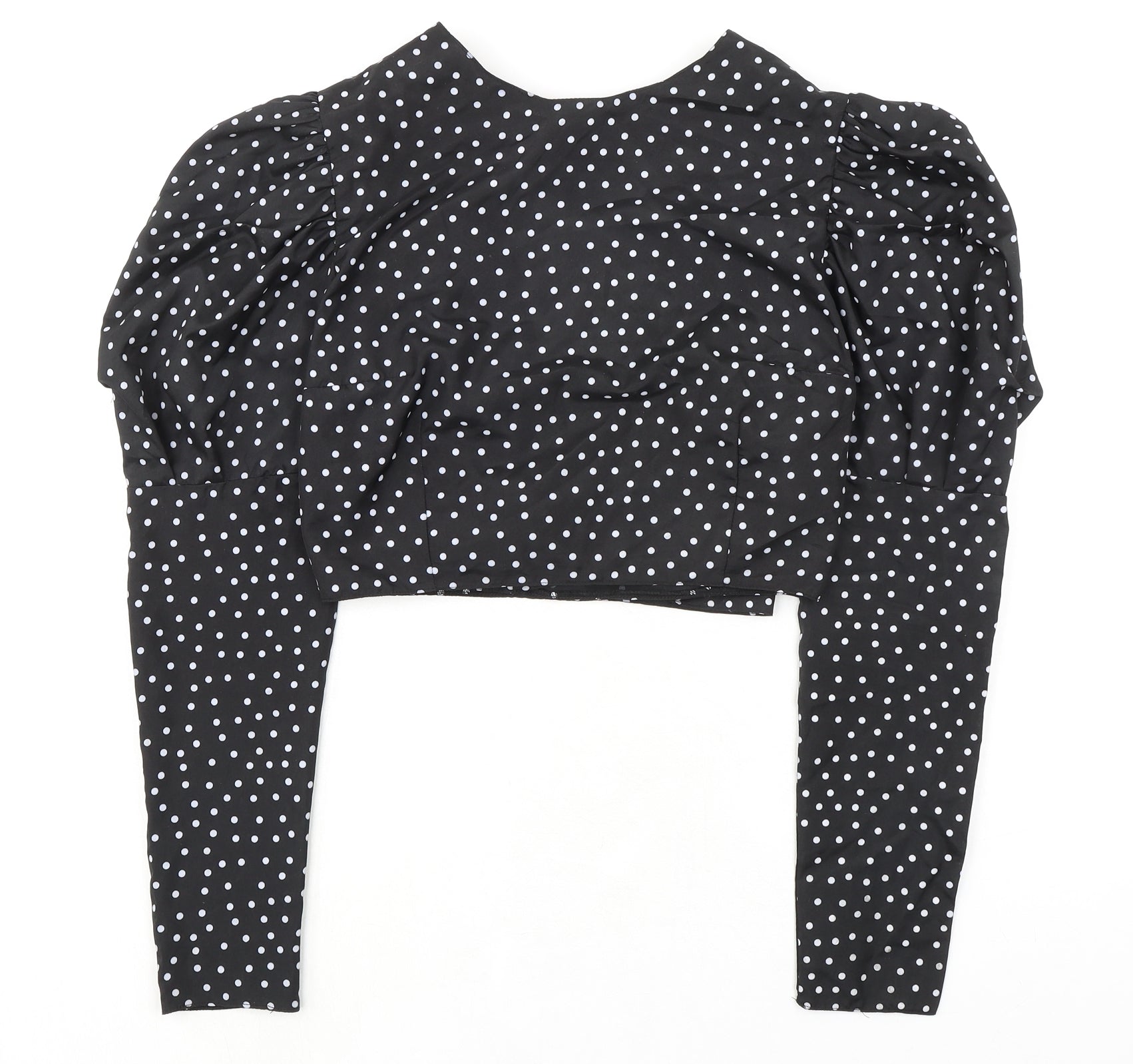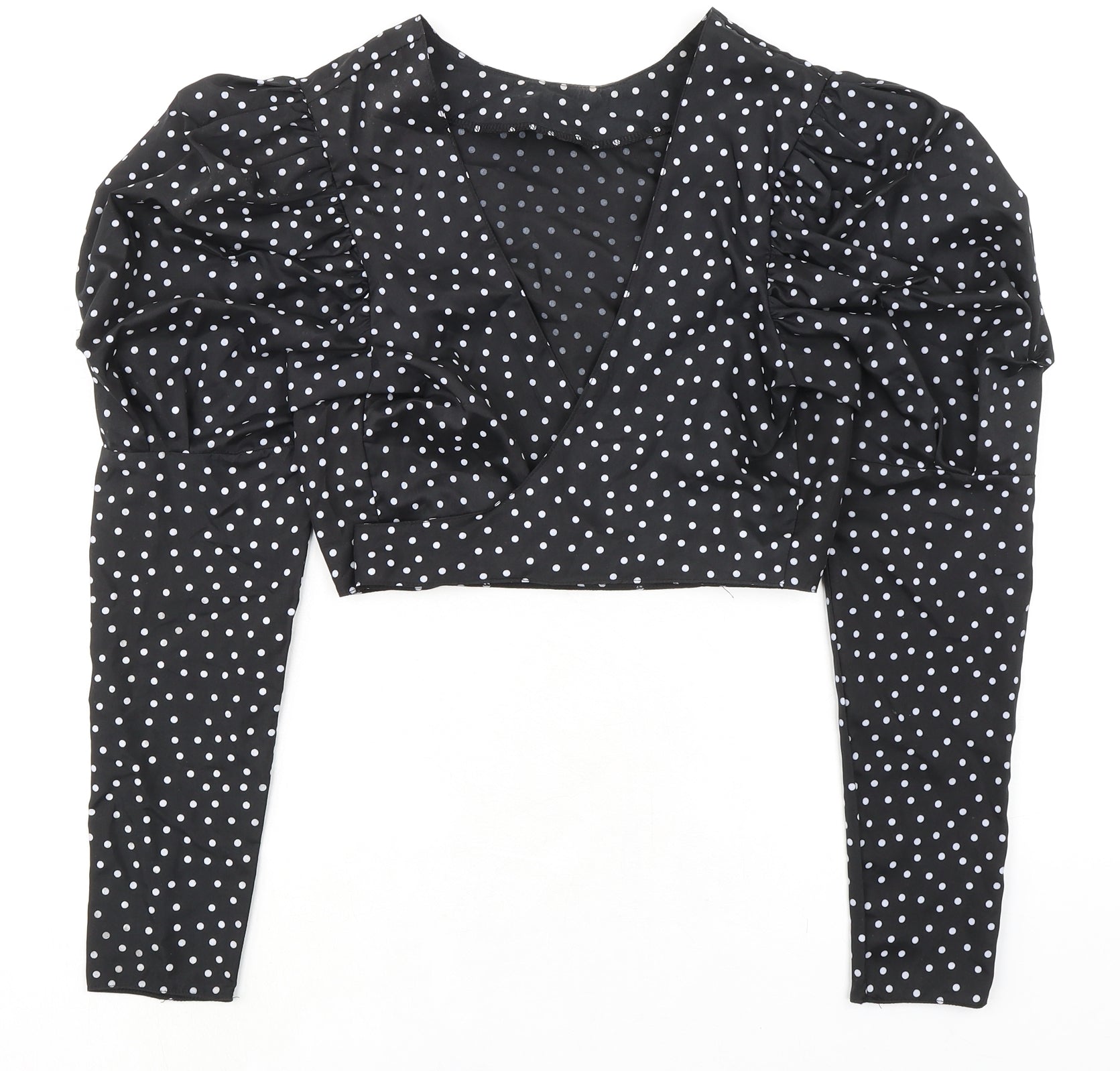 Boohoo Womens Black Polka Dot Polyester Cropped Blouse Size 12 V-Neck - Puff Sleeves