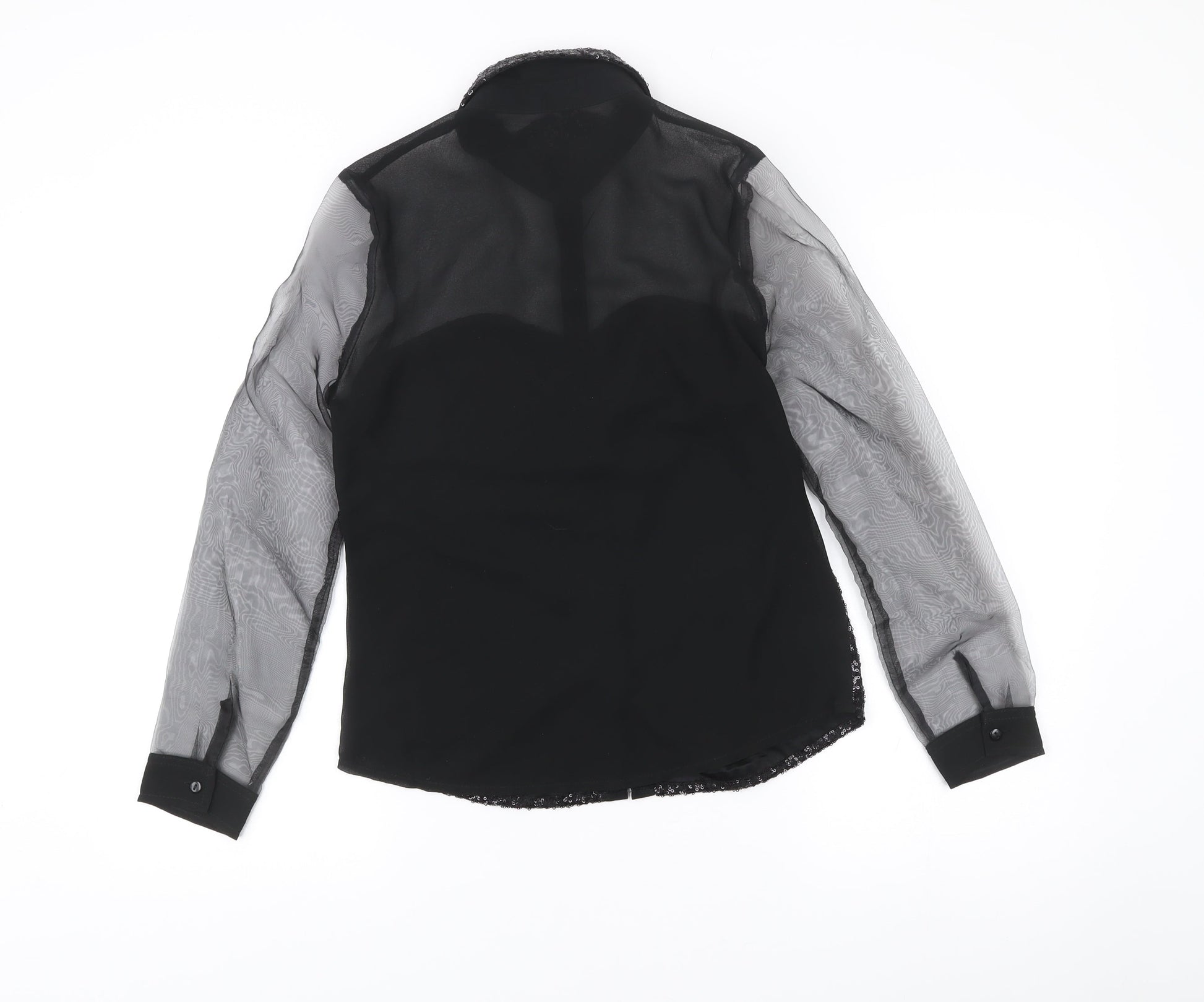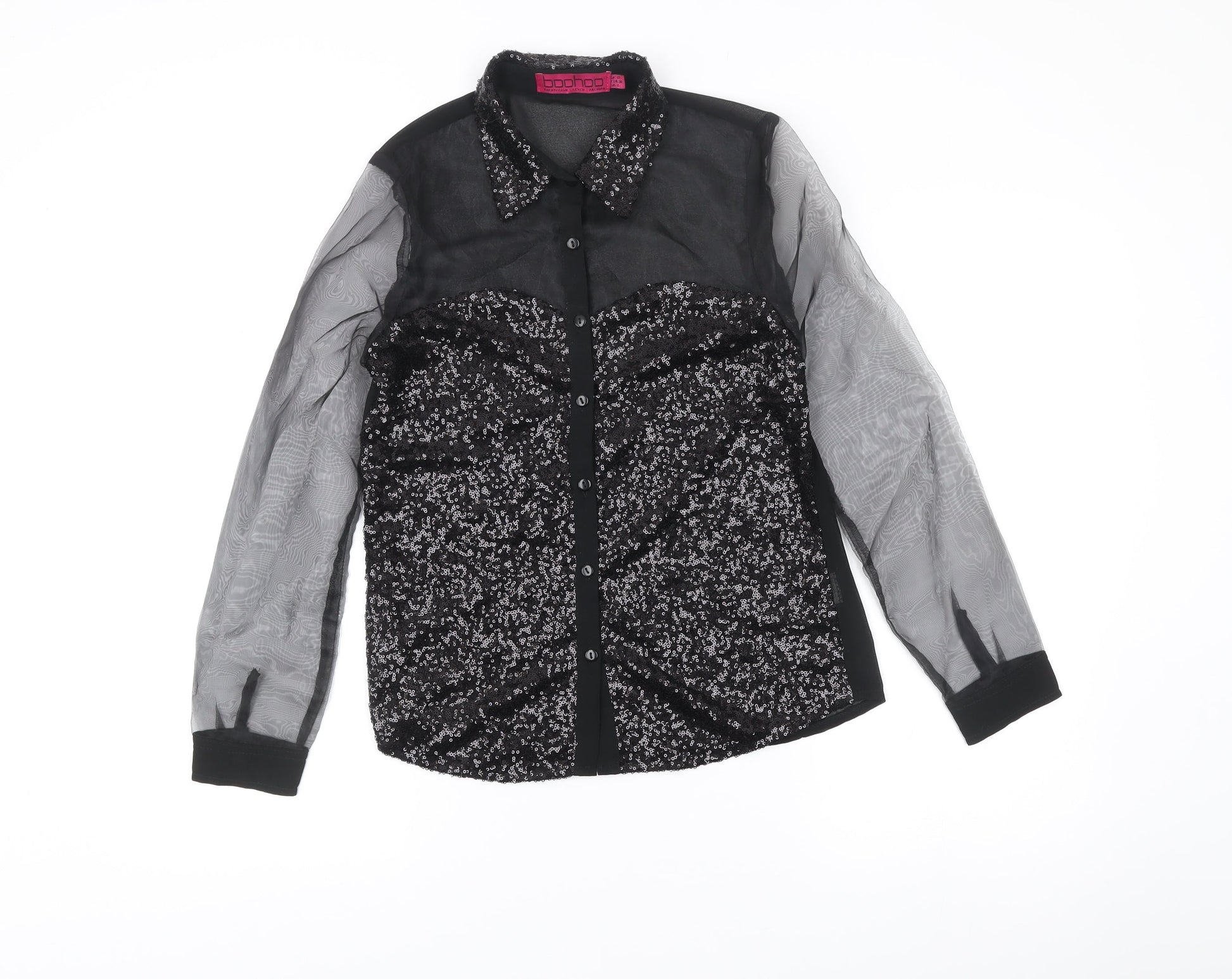 Boohoo Womens Black Sequin Sheer Long Sleeve Button-Up Blouse Size 8