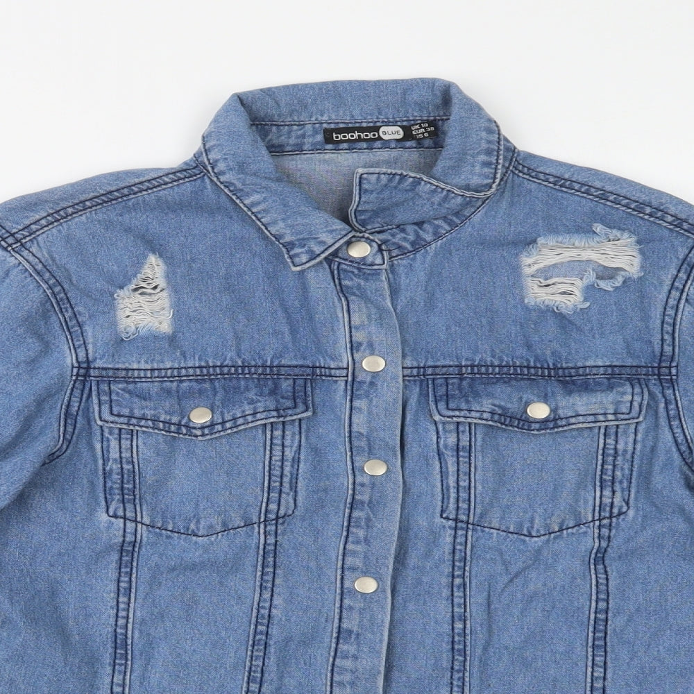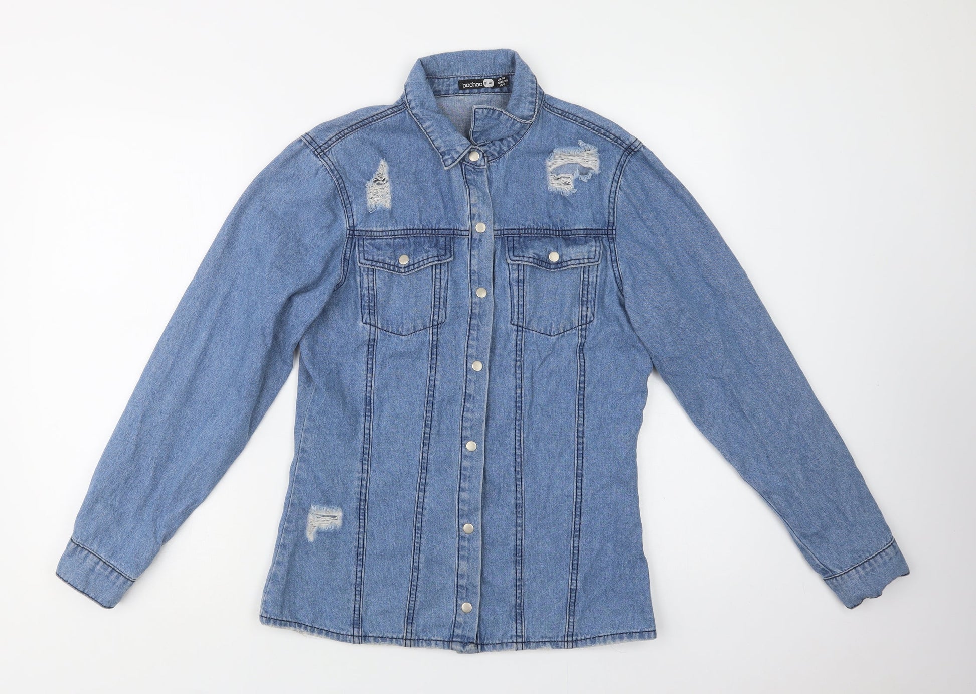 Boohoo Womens Blue Cotton Basic Button-Up Size 10 Collared