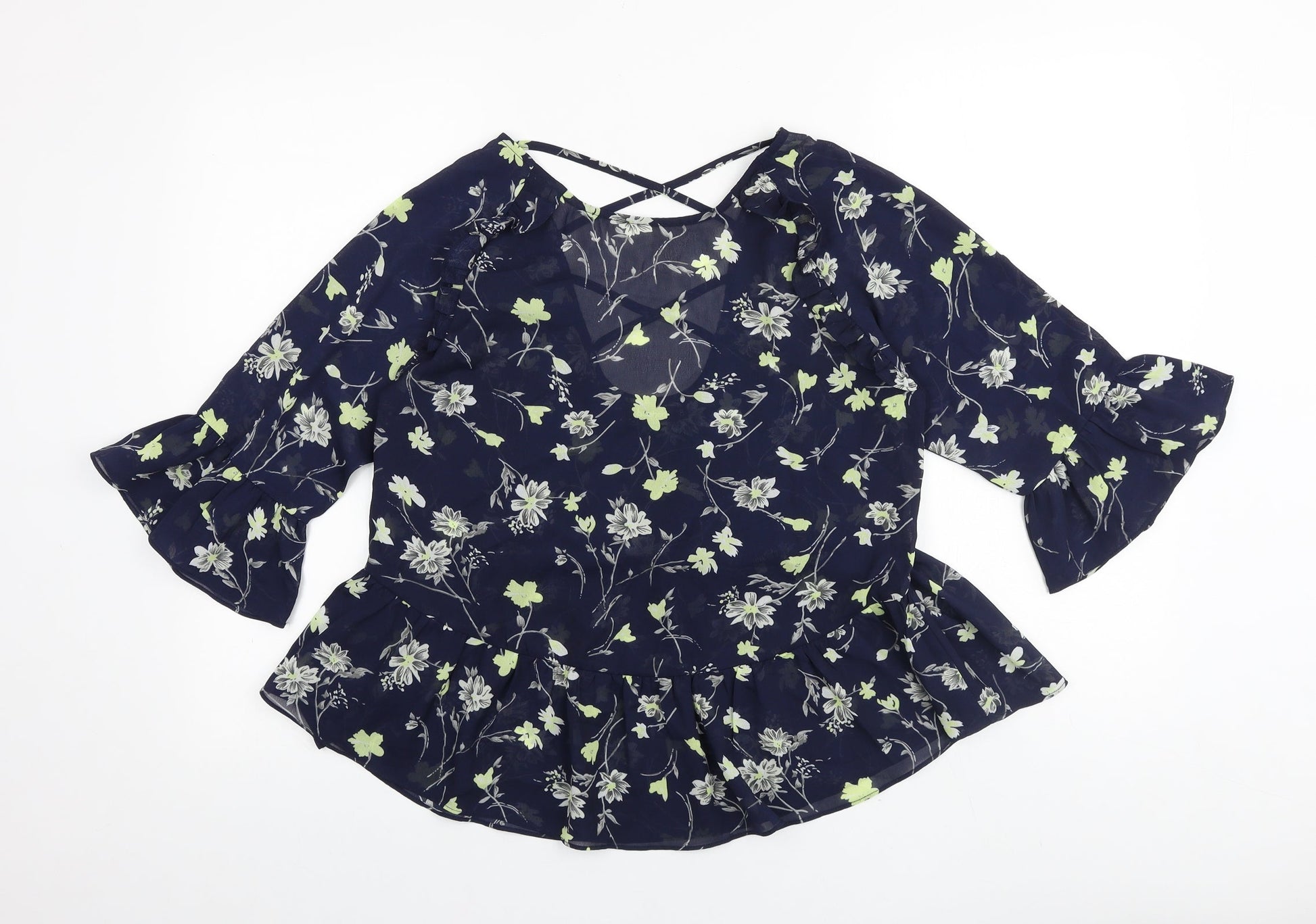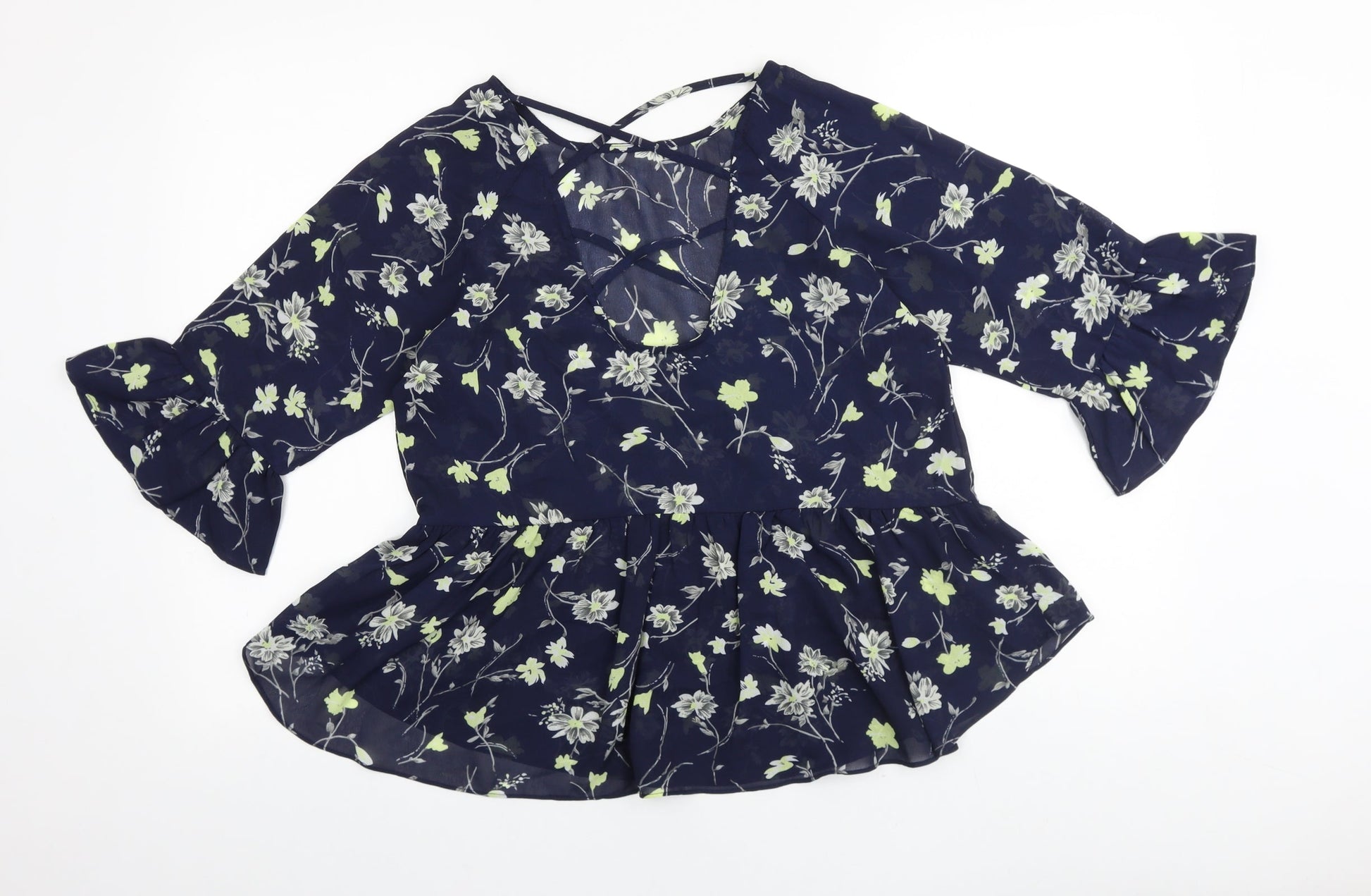 Boohoo Womens Blue Floral Polyester Basic Blouse Size 8 V-Neck