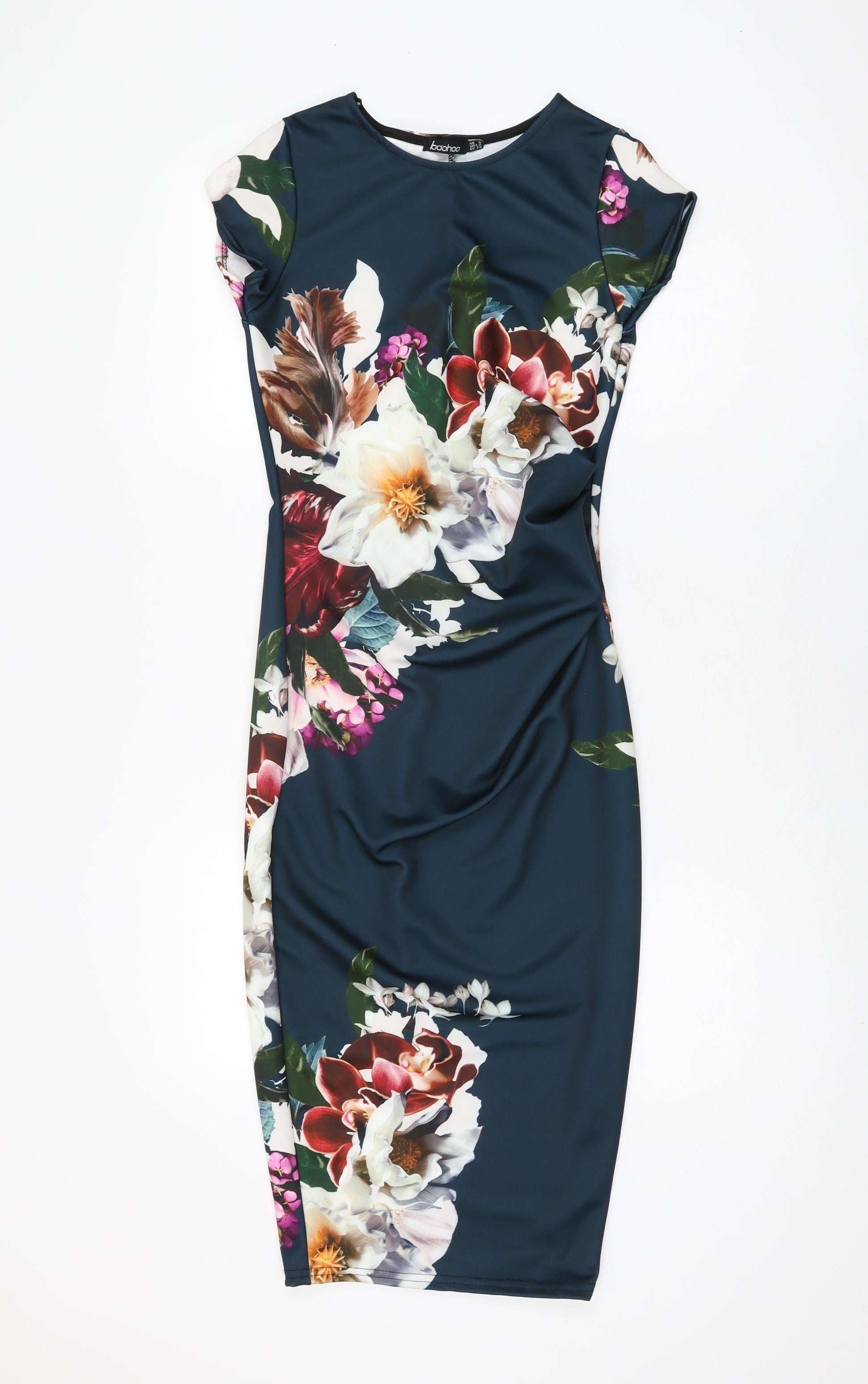 Boohoo Womens Blue Floral Polyester Bodycon Size 6 Round Neck Pullover
