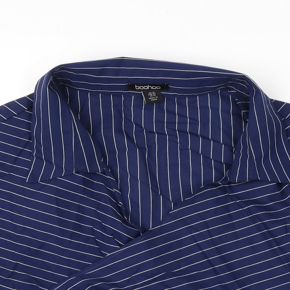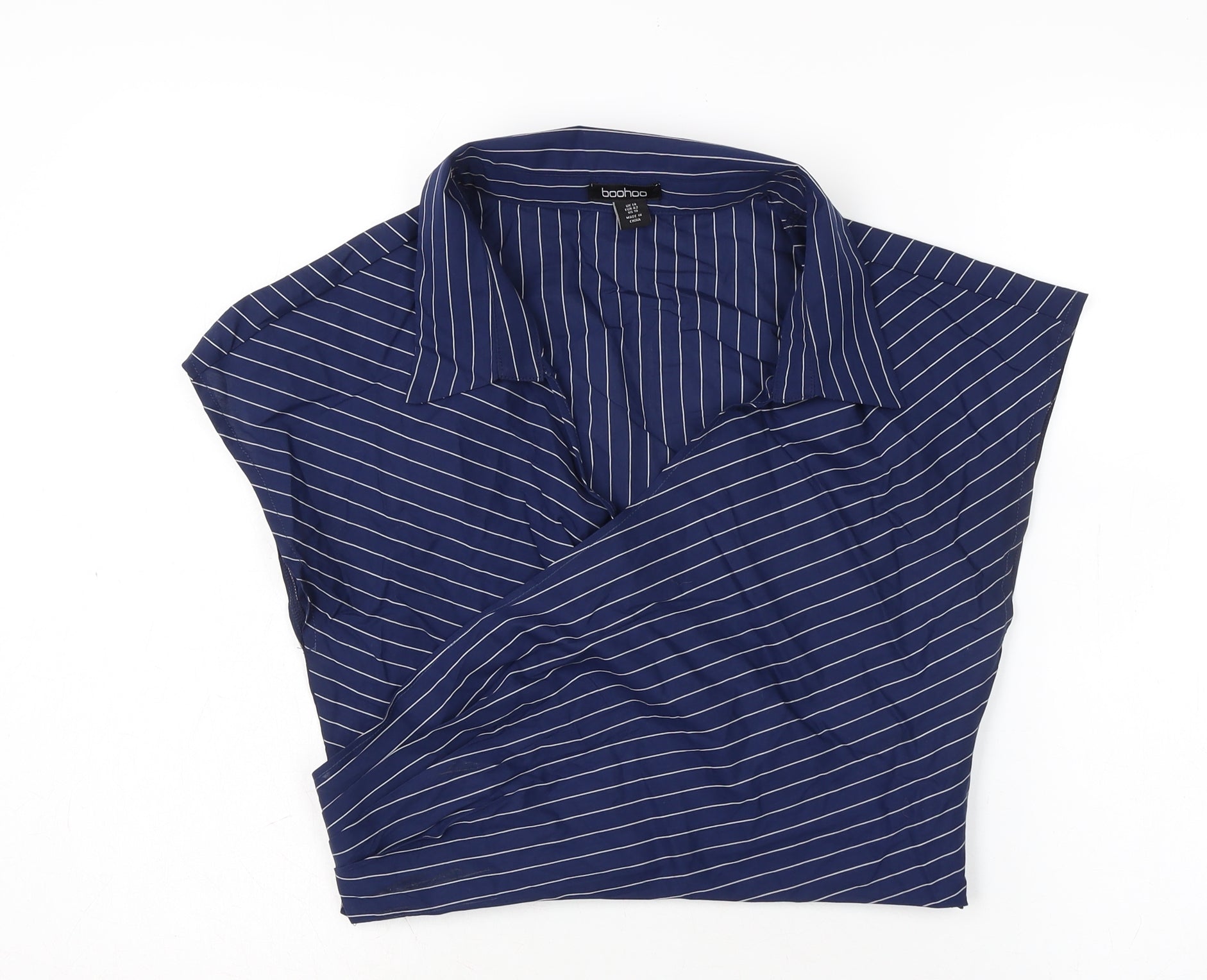 Boohoo Womens Blue Herringbone Cotton Cropped Blouse Size 14 V-Neck