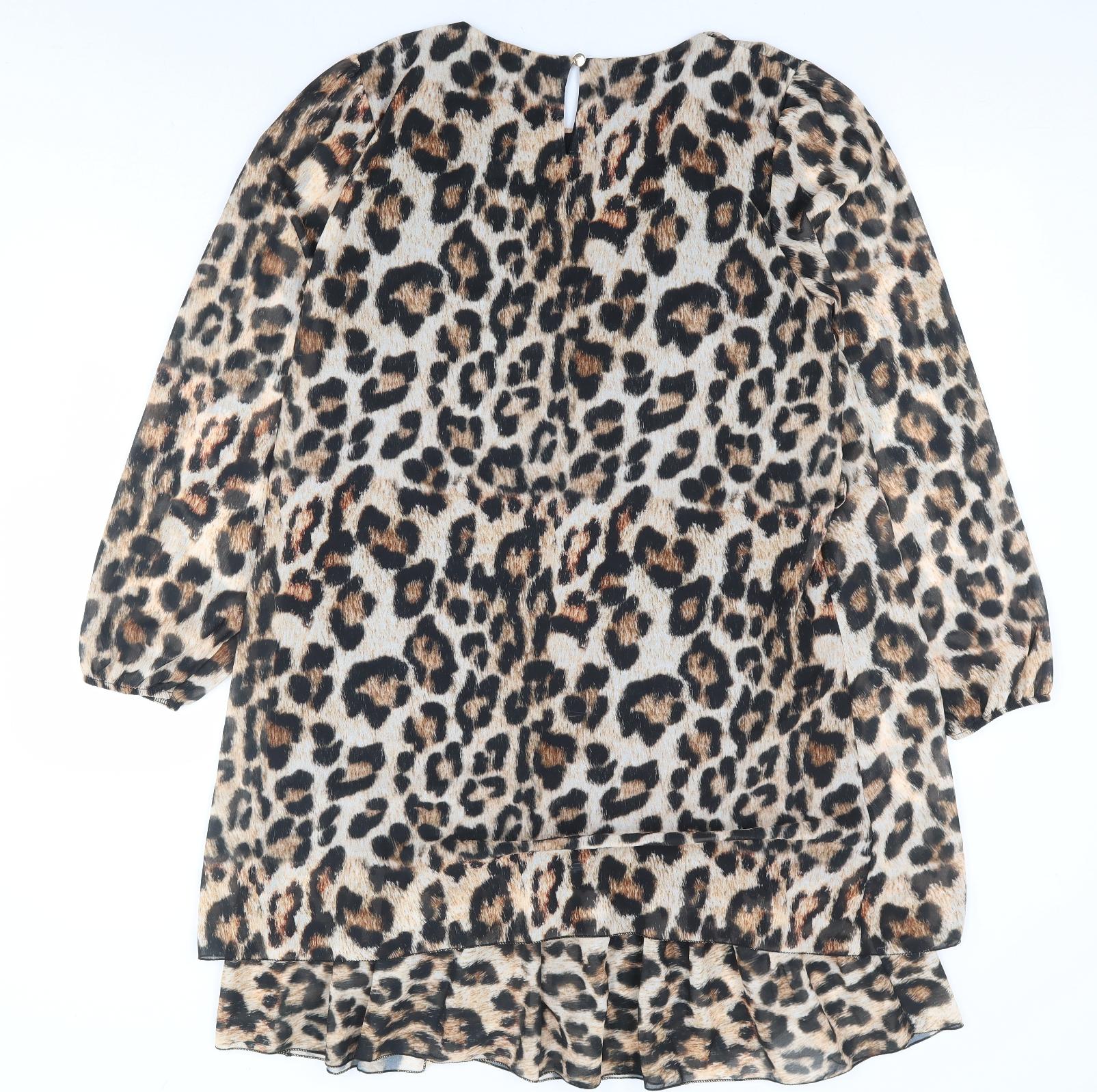 Boohoo Womens Brown Animal Print Polyester A-Line Size 12 Round Neck Button - Leopard Print