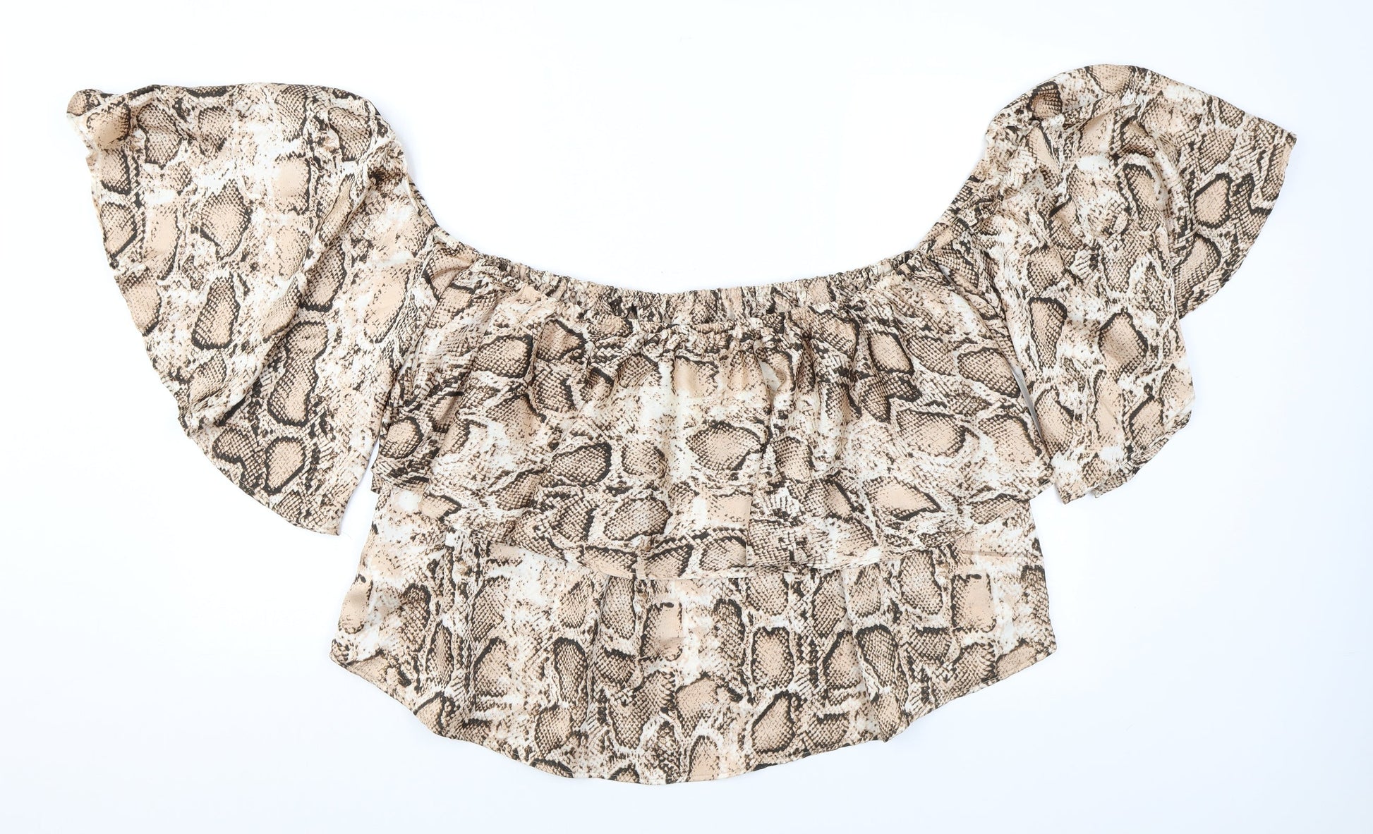 Boohoo Womens Brown Animal Print Polyester Basic Blouse Size 16 Off the Shoulder - Ruffles