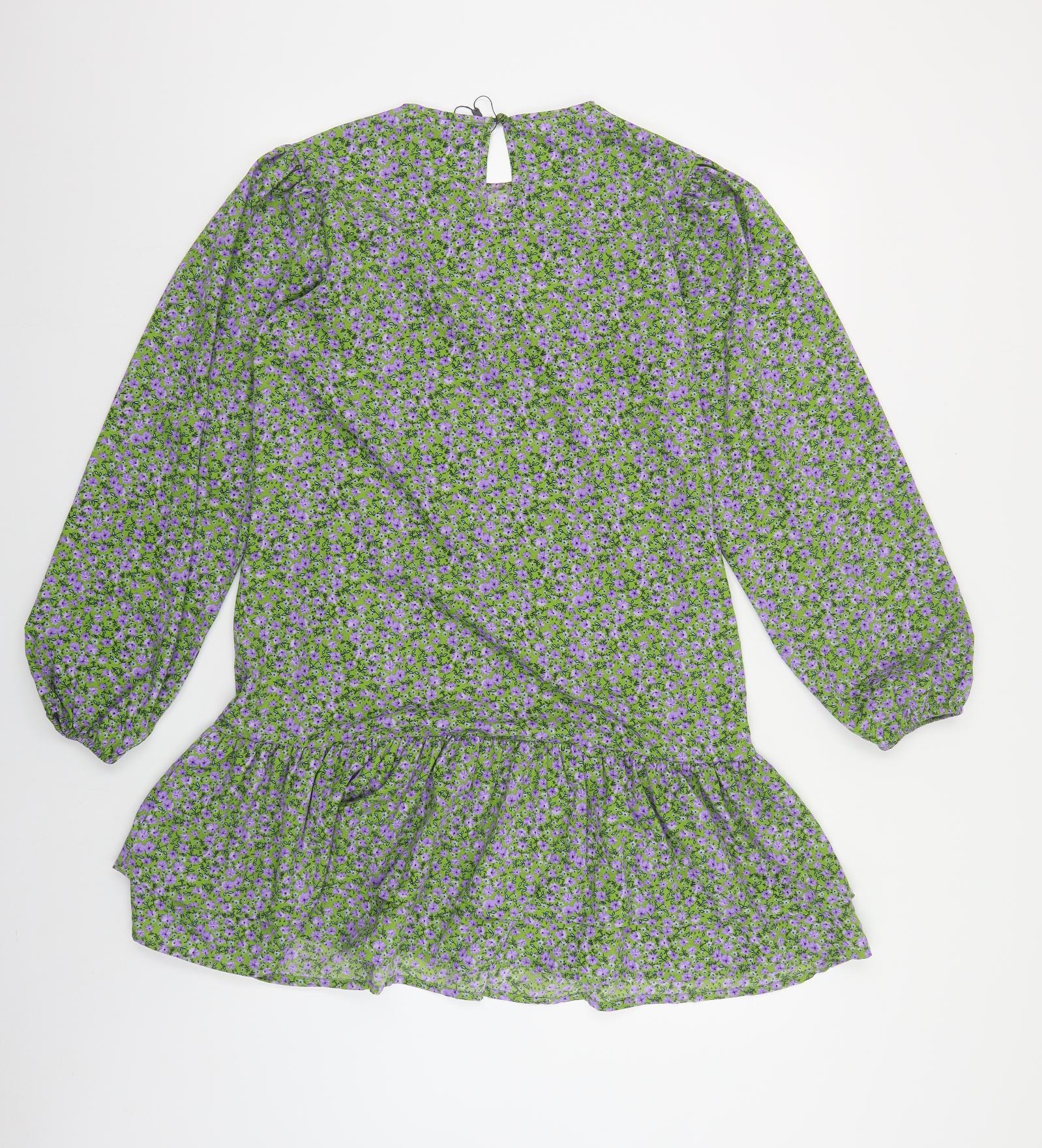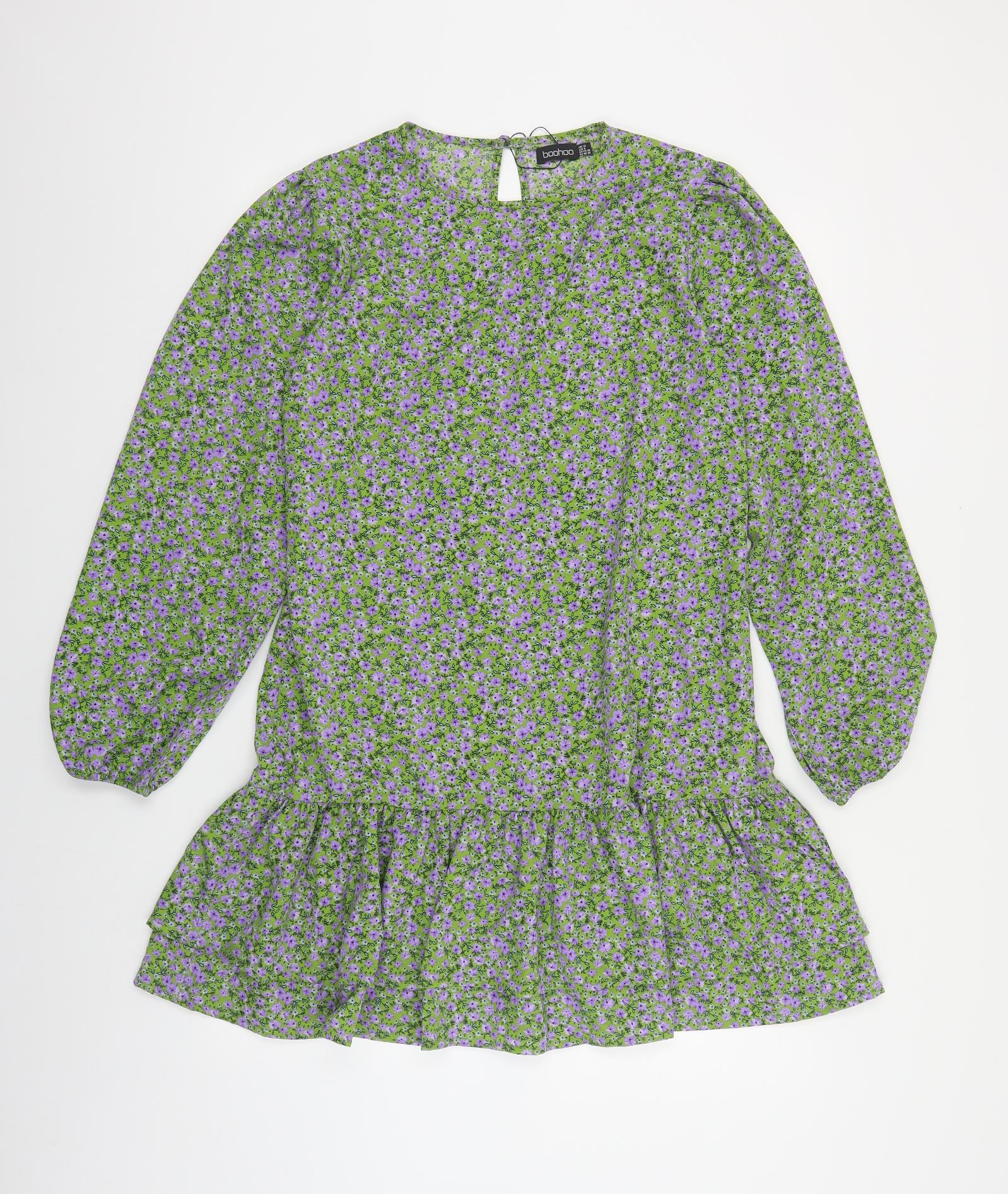 Boohoo Womens Green Floral Polyester A-Line Size 12 Round Neck Button