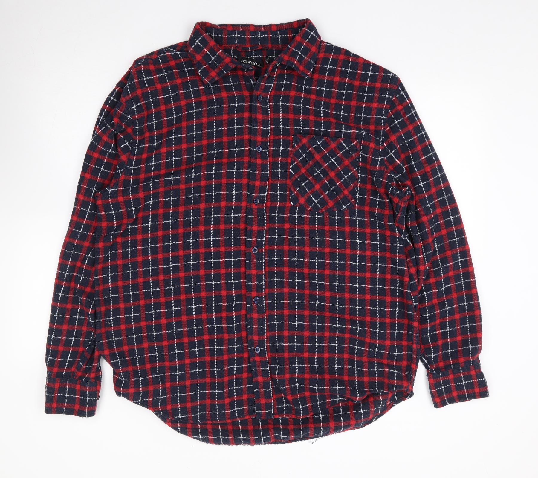 Boohoo Womens Red Plaid Cotton Jersey Button-Up Size 14 Collared