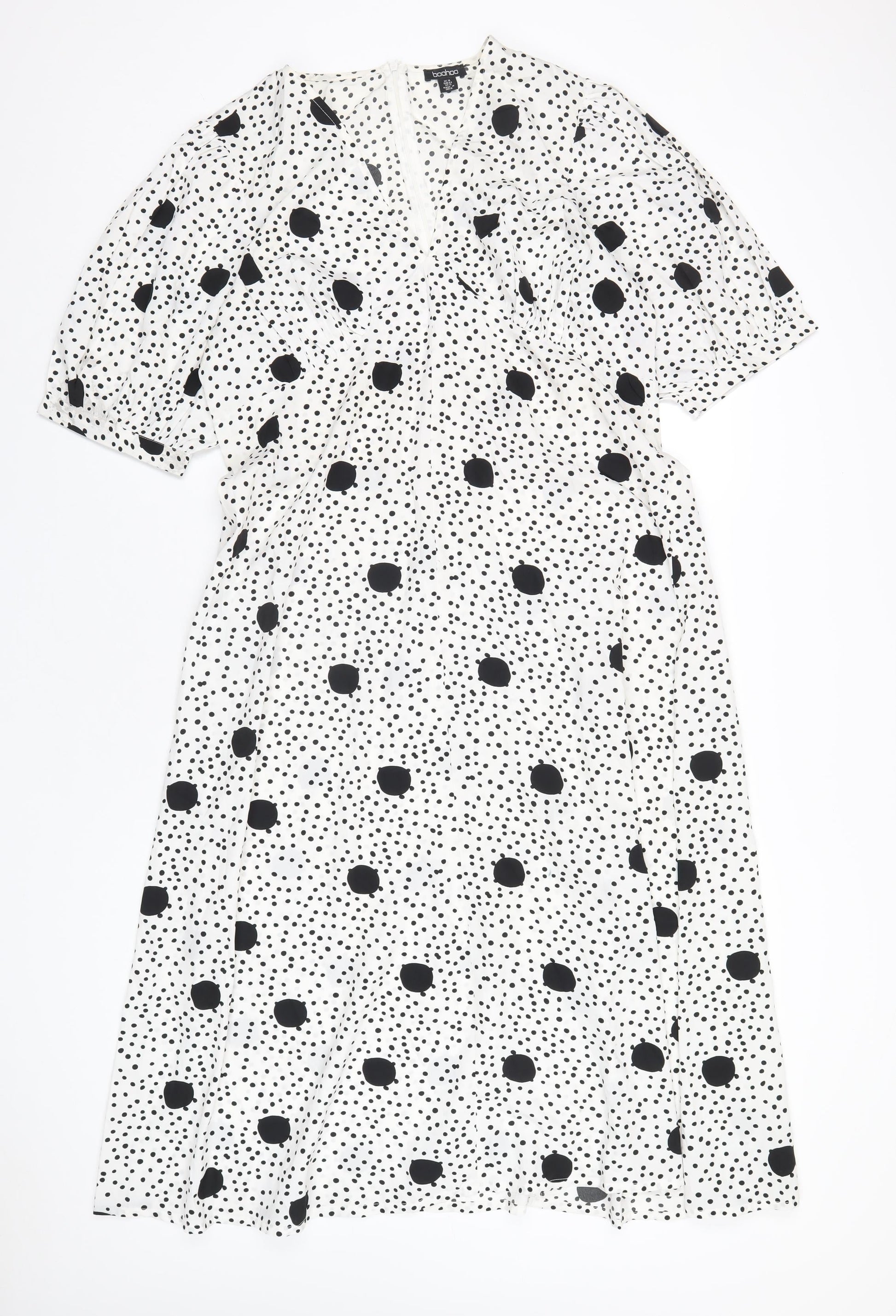 Boohoo Womens White Polka Dot Polyester A-Line Size 16 V-Neck Zip