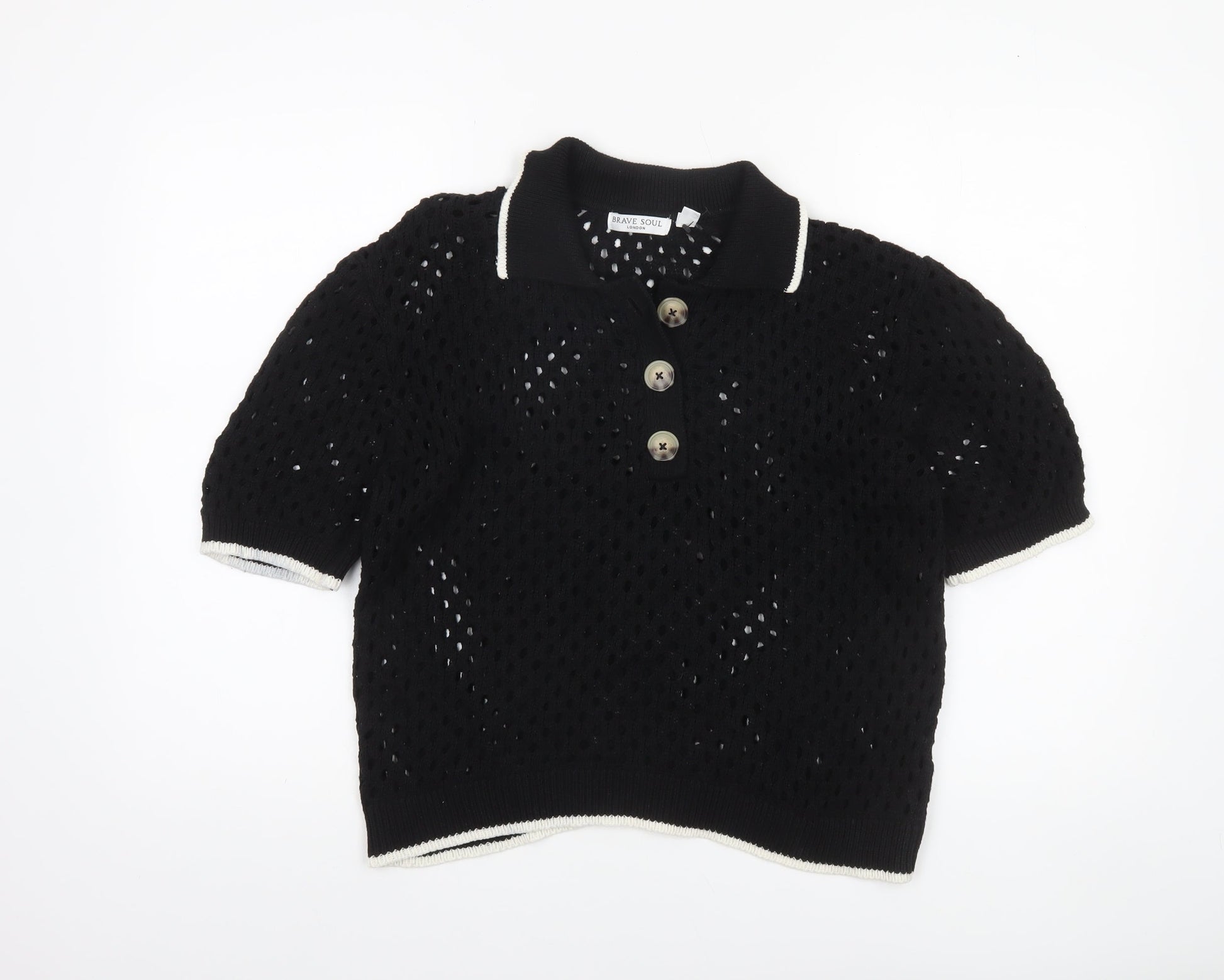 Brave Soul Women's Black Open Knit Collared Henley Jumper L