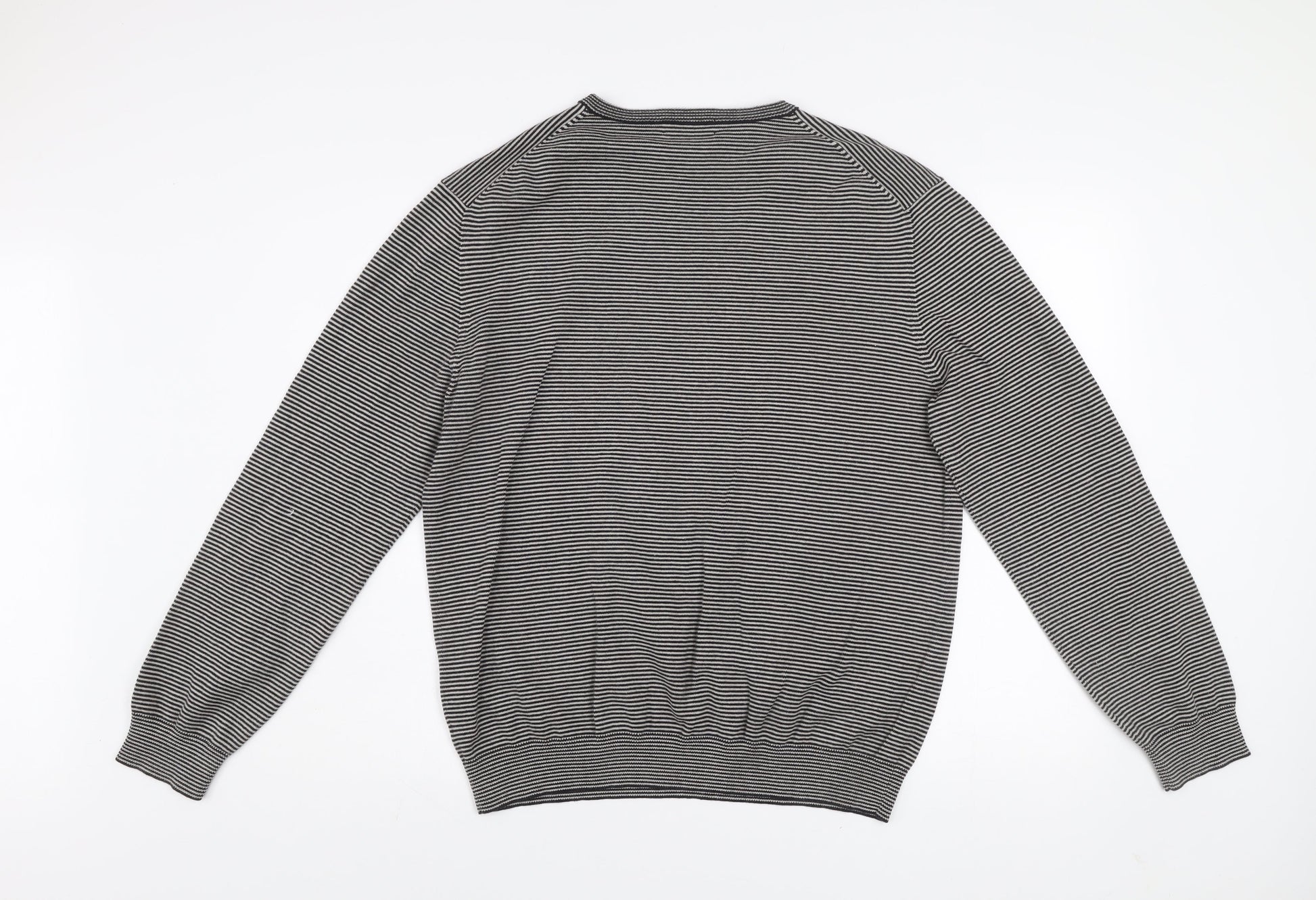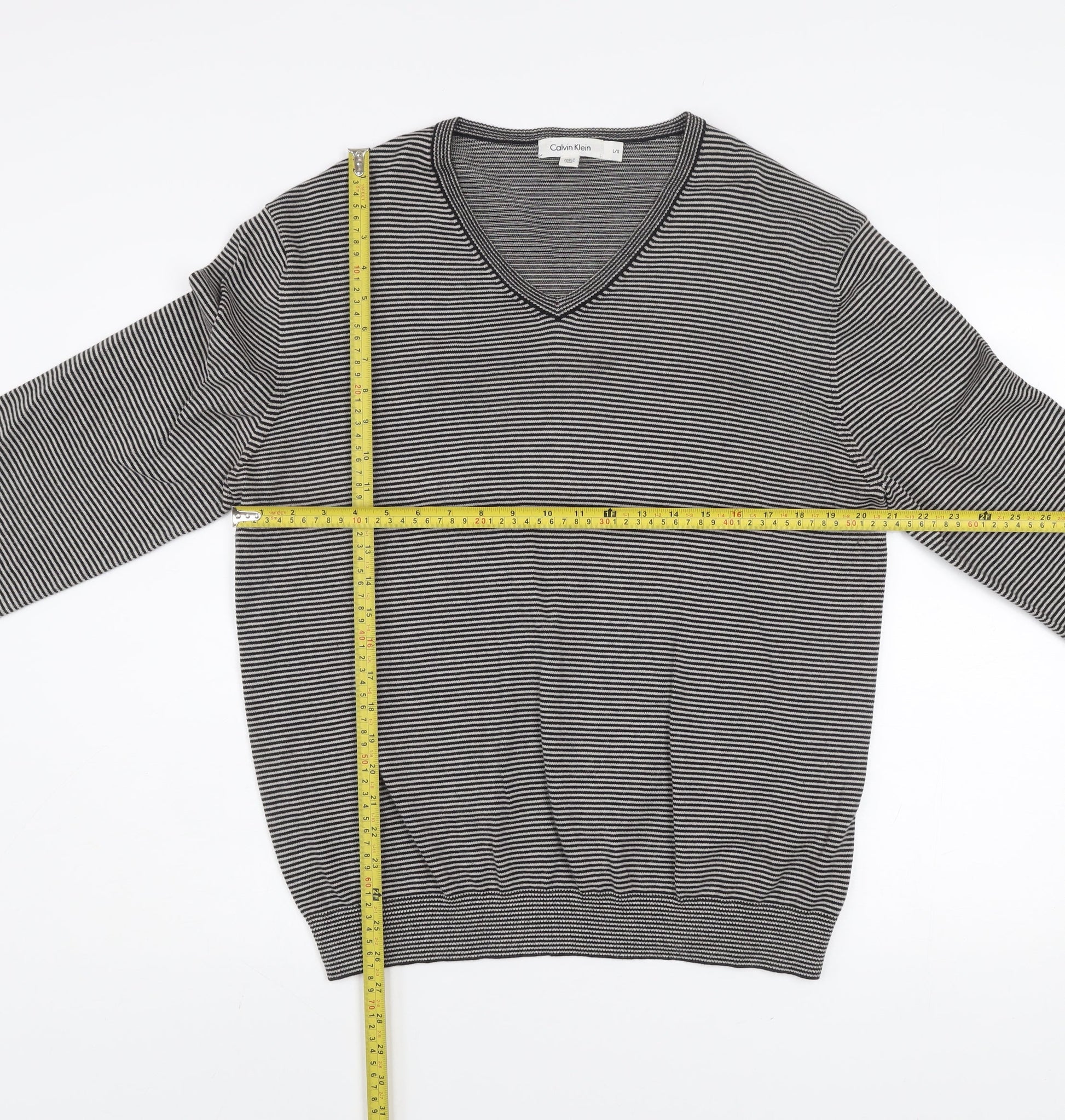 Calvin Klein Men’s Grey Striped V-Neck Cotton Jumper Size L