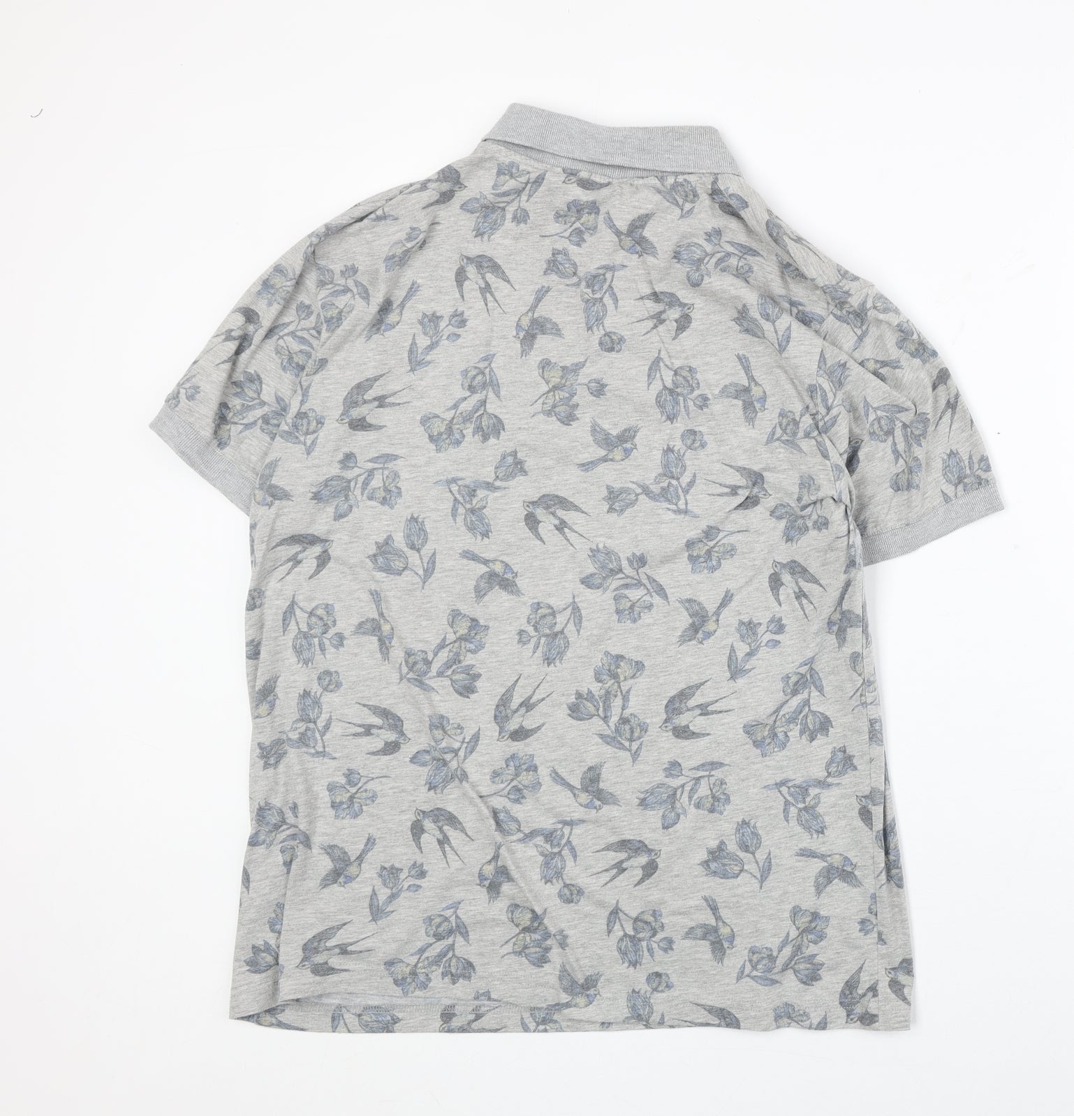 Cedar Wood State Mens Grey Floral Cotton Polo Size L Collared Button - Bird Pattern