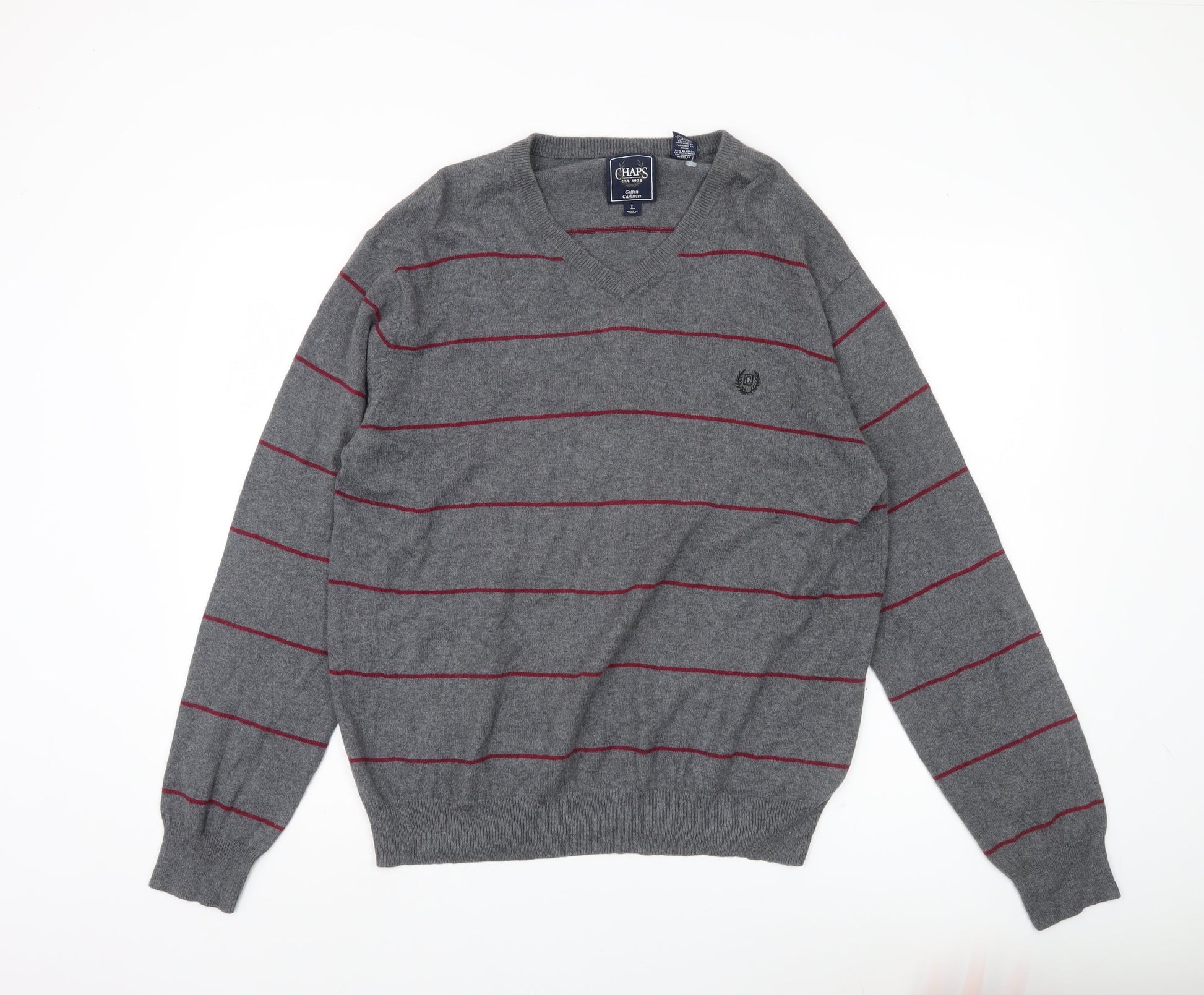 Chaps Men’s Grey Striped Cotton Cashmere V-Neck Jumper Size L