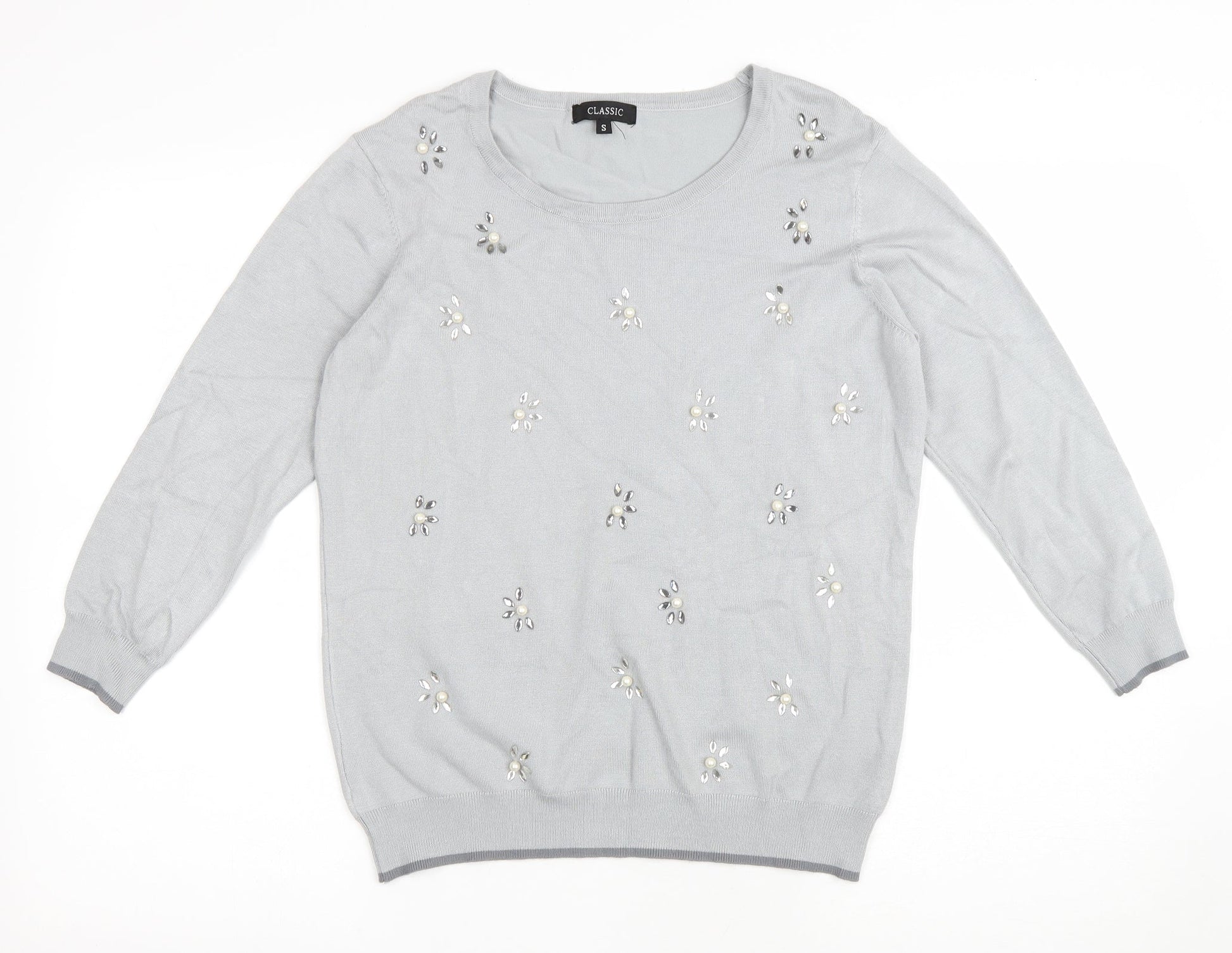 Classic Womens Grey Round Neck Floral Viscose Pullover Jumper Size S