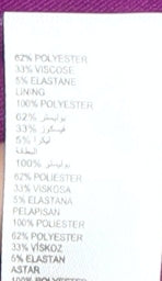- Material Breakdown: 62% Polyester 33% Viscose 5% Elastane