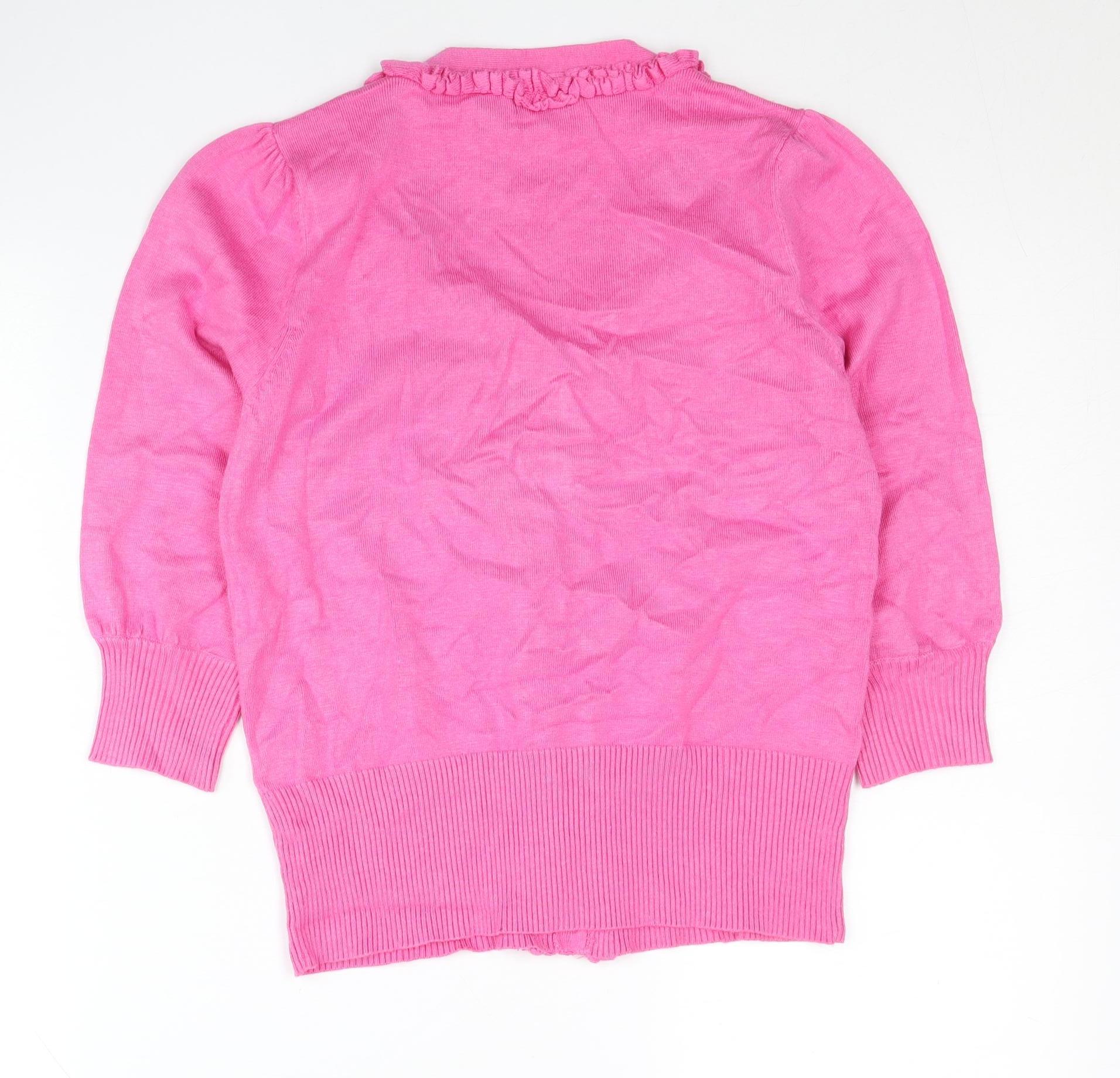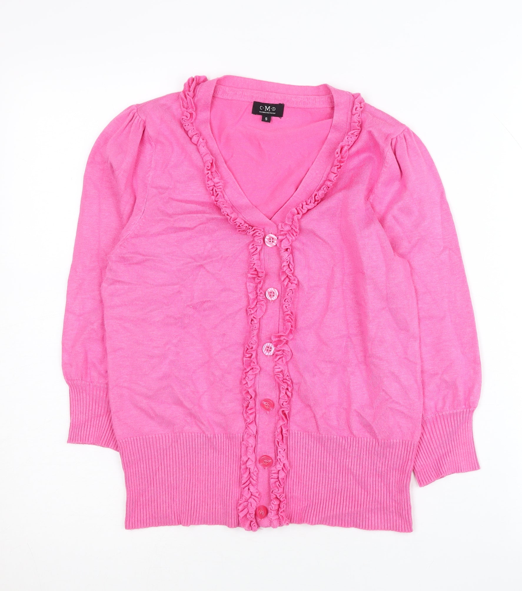 CMD Womens Pink V-Neck Ruffle Cardigan S Knit 3/4 Sleeve