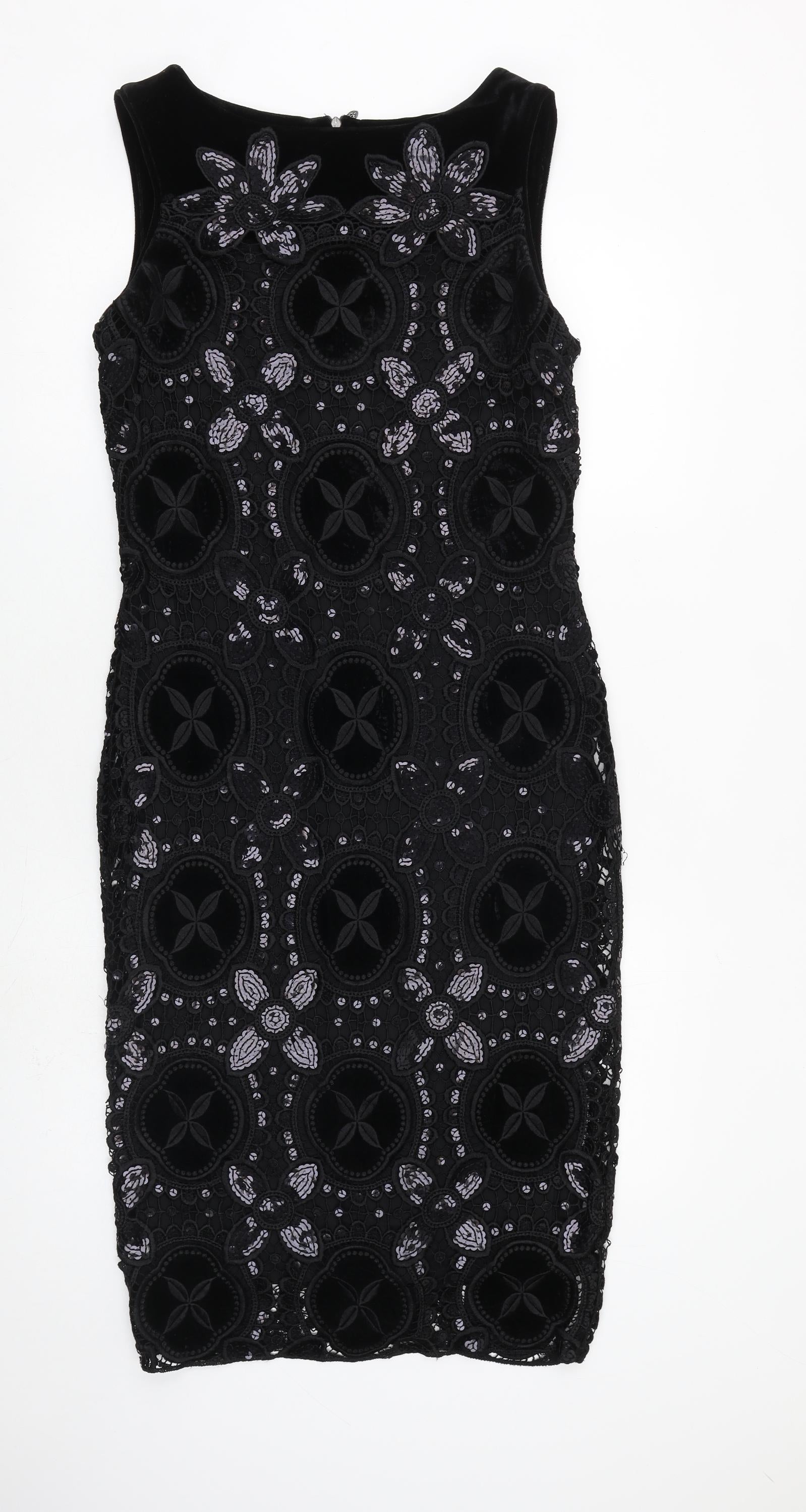 Damsel in a Dress Womens Black Geometric Polyester Shift Size 12 Boat Neck Zip