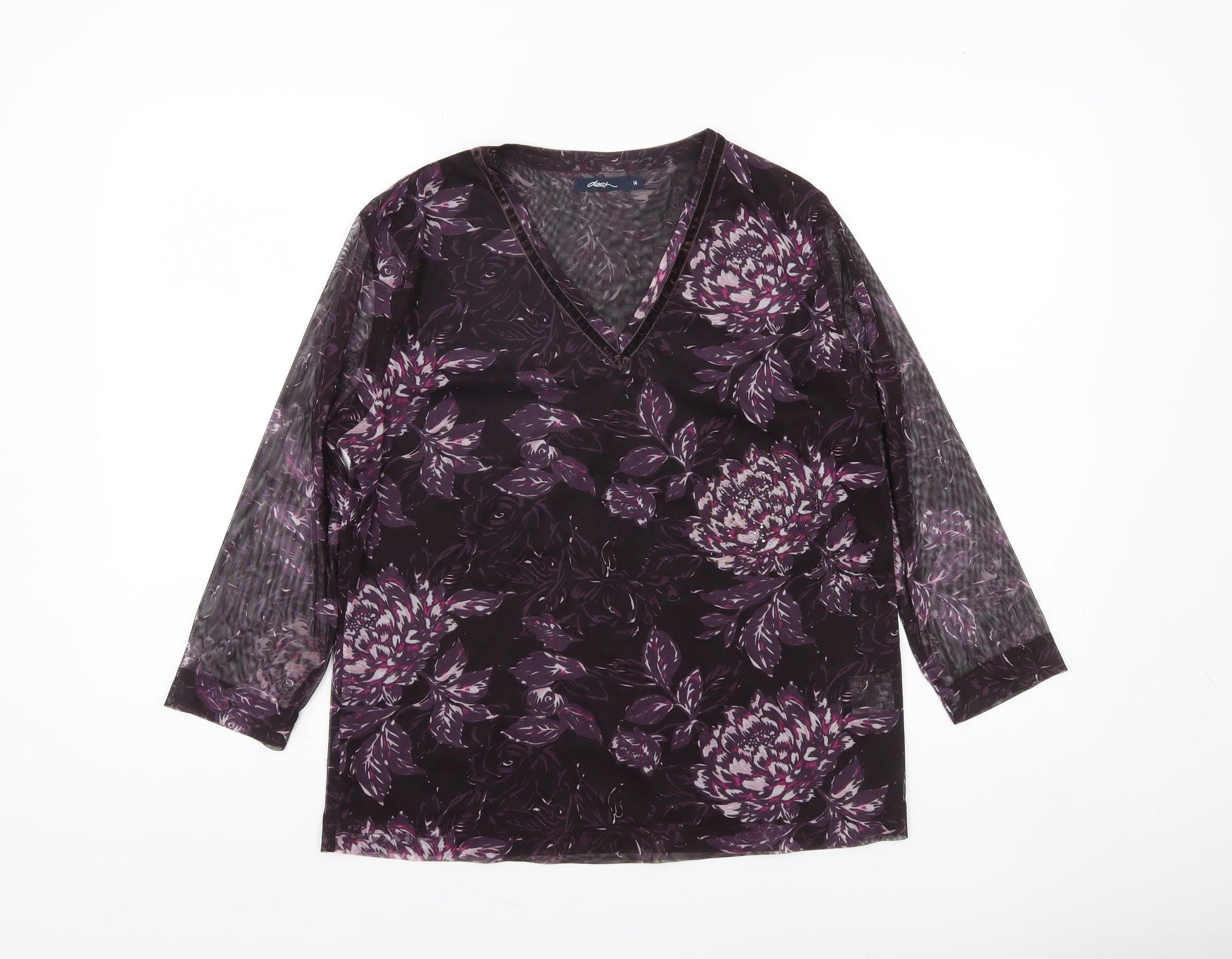 Dash Women's Purple Floral V-Neck Long Sleeve Mesh Top Size 14