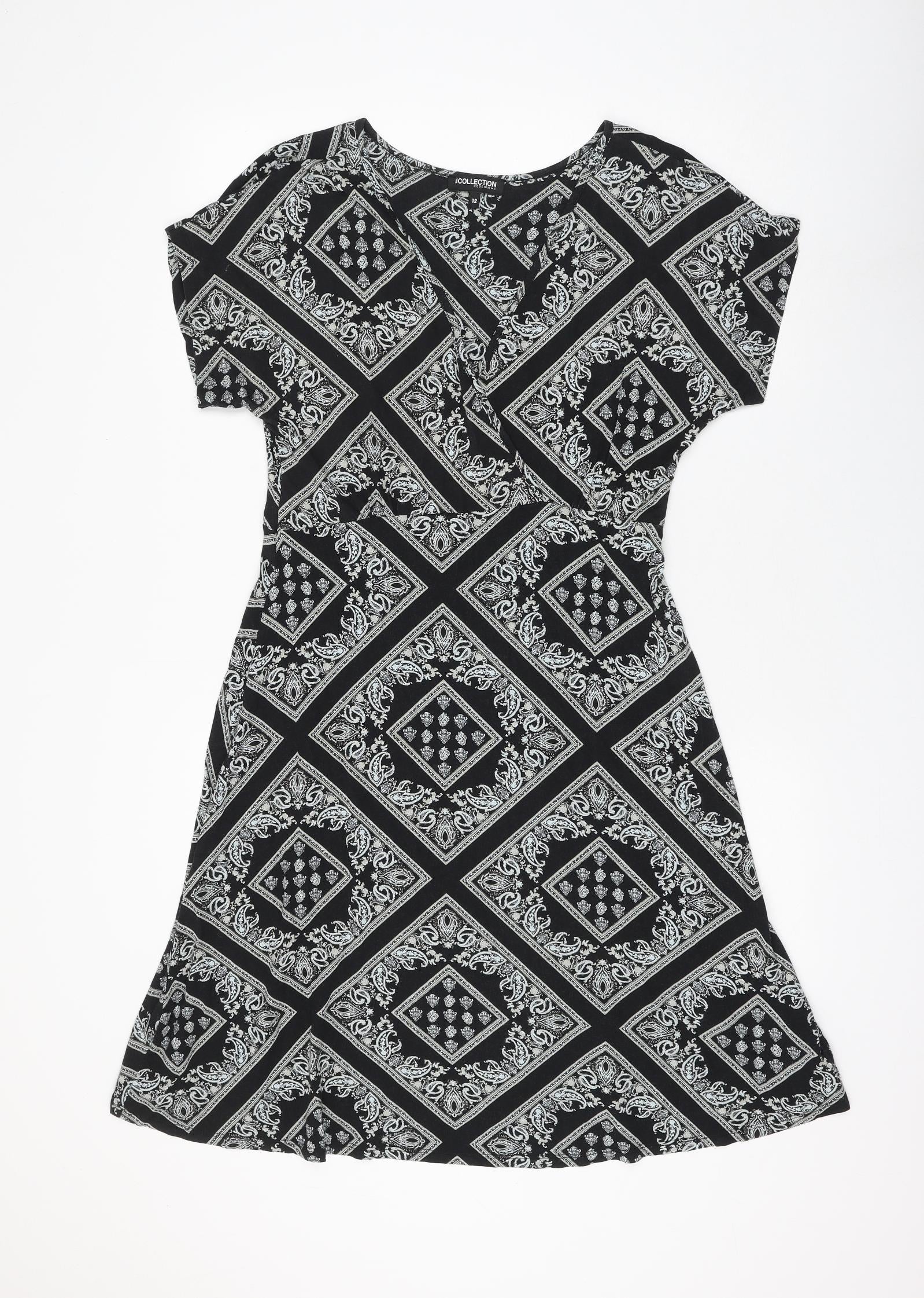 Debenhams Womens Black Geometric Viscose A-Line Size 12 V-Neck Pullover
