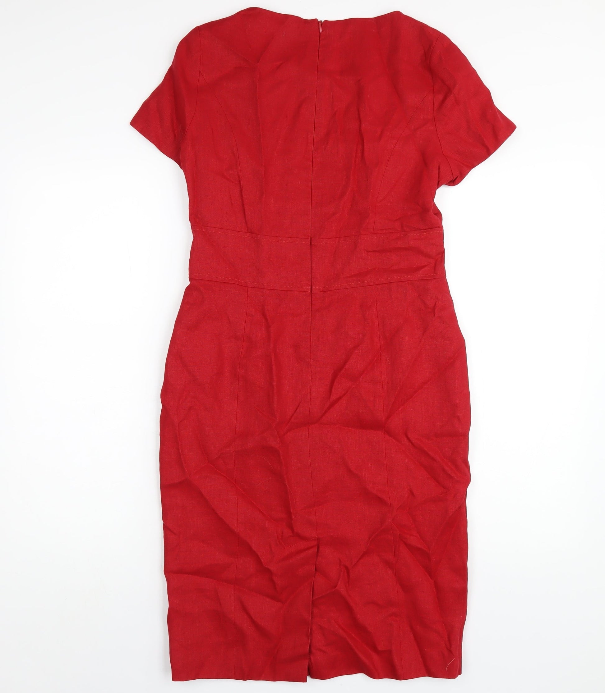 Debenhams Womens Red Linen Pencil Dress Size 10 Square Neck Zip