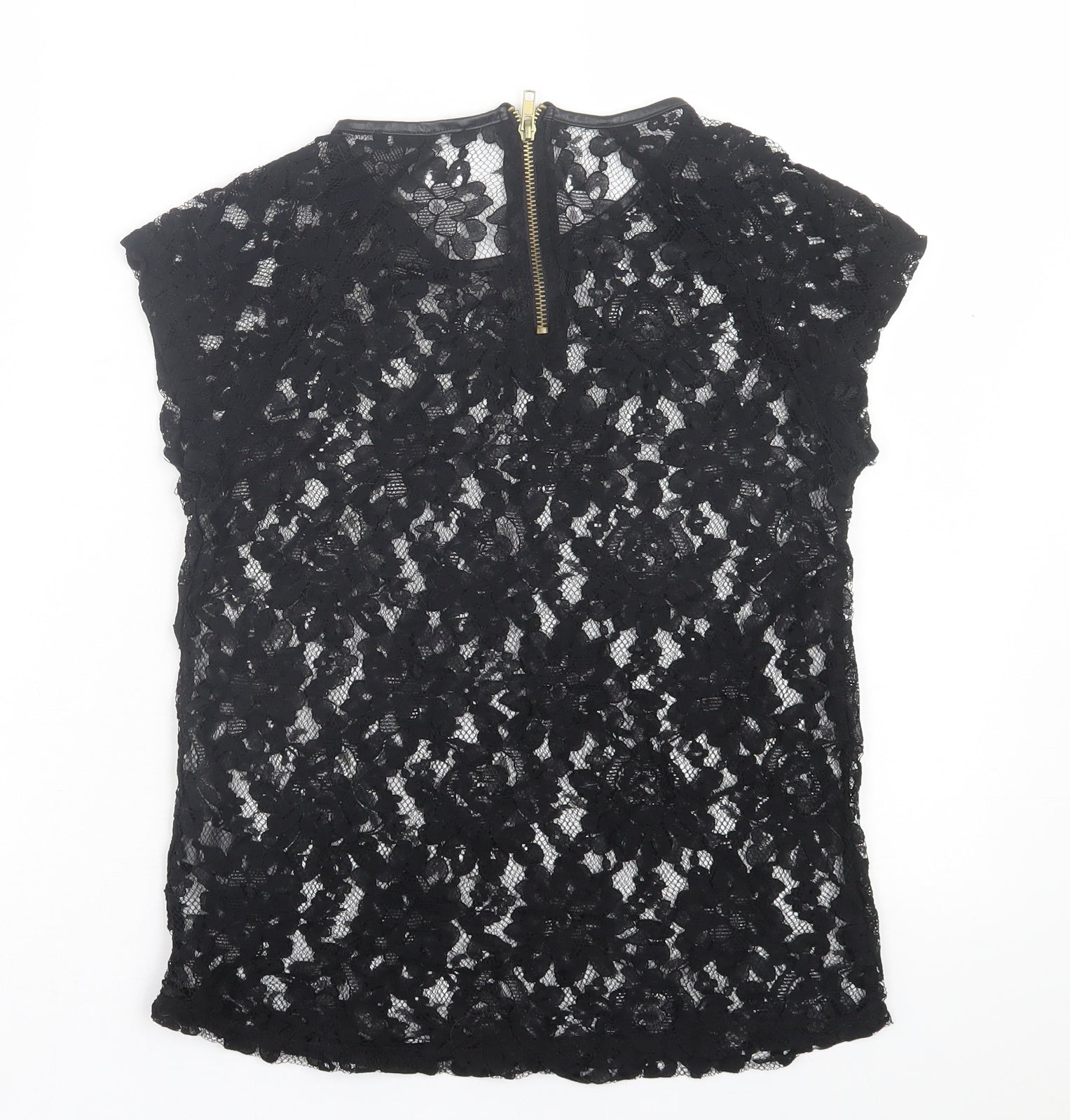 Definitions Womens Black Floral Polyester Basic T-Shirt Size 10 Crew Neck