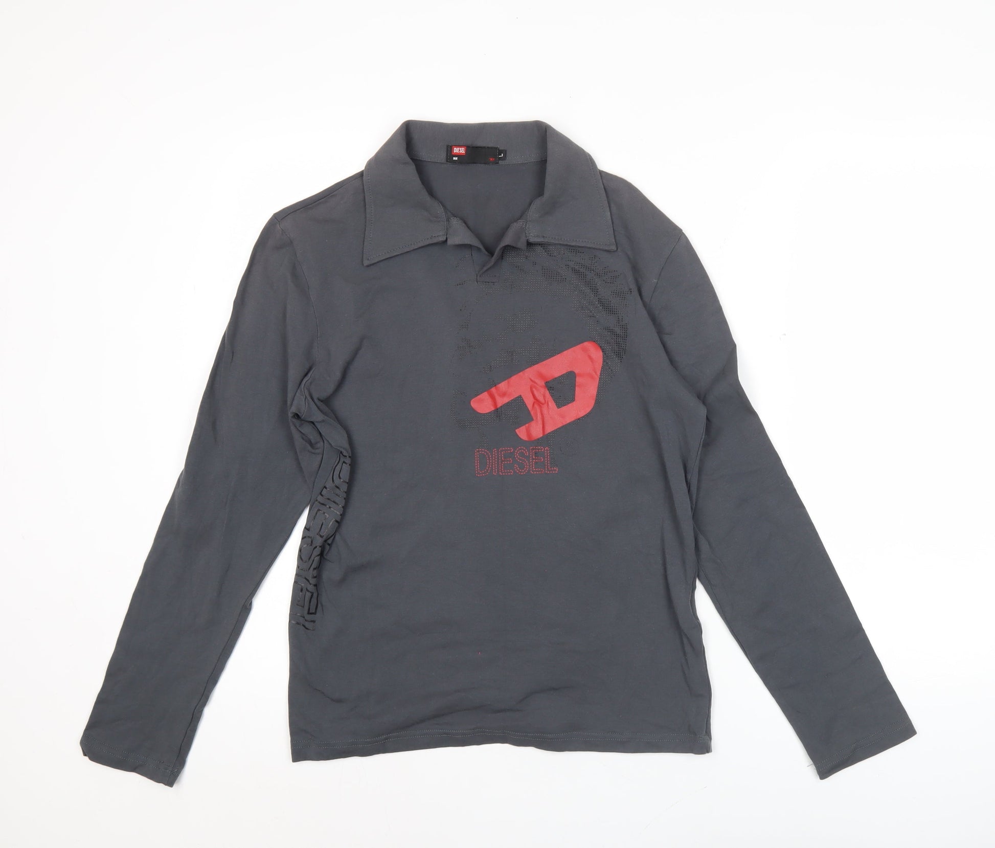 Diesel Mens Grey Long Sleeve Polo Shirt L Cotton Graphic Logo