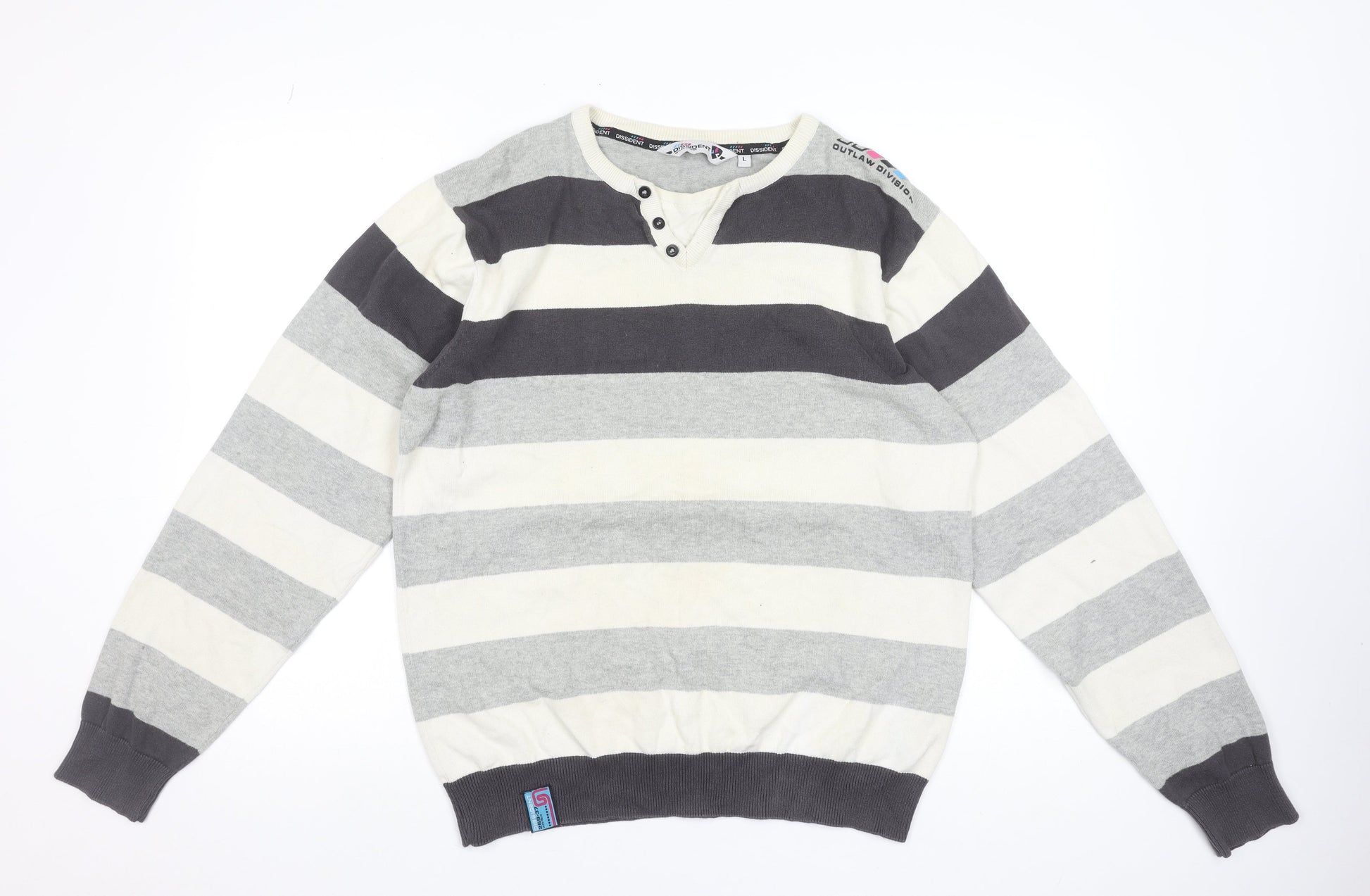 Dissident Men's Grey Striped Henley Cotton Jumper Size L