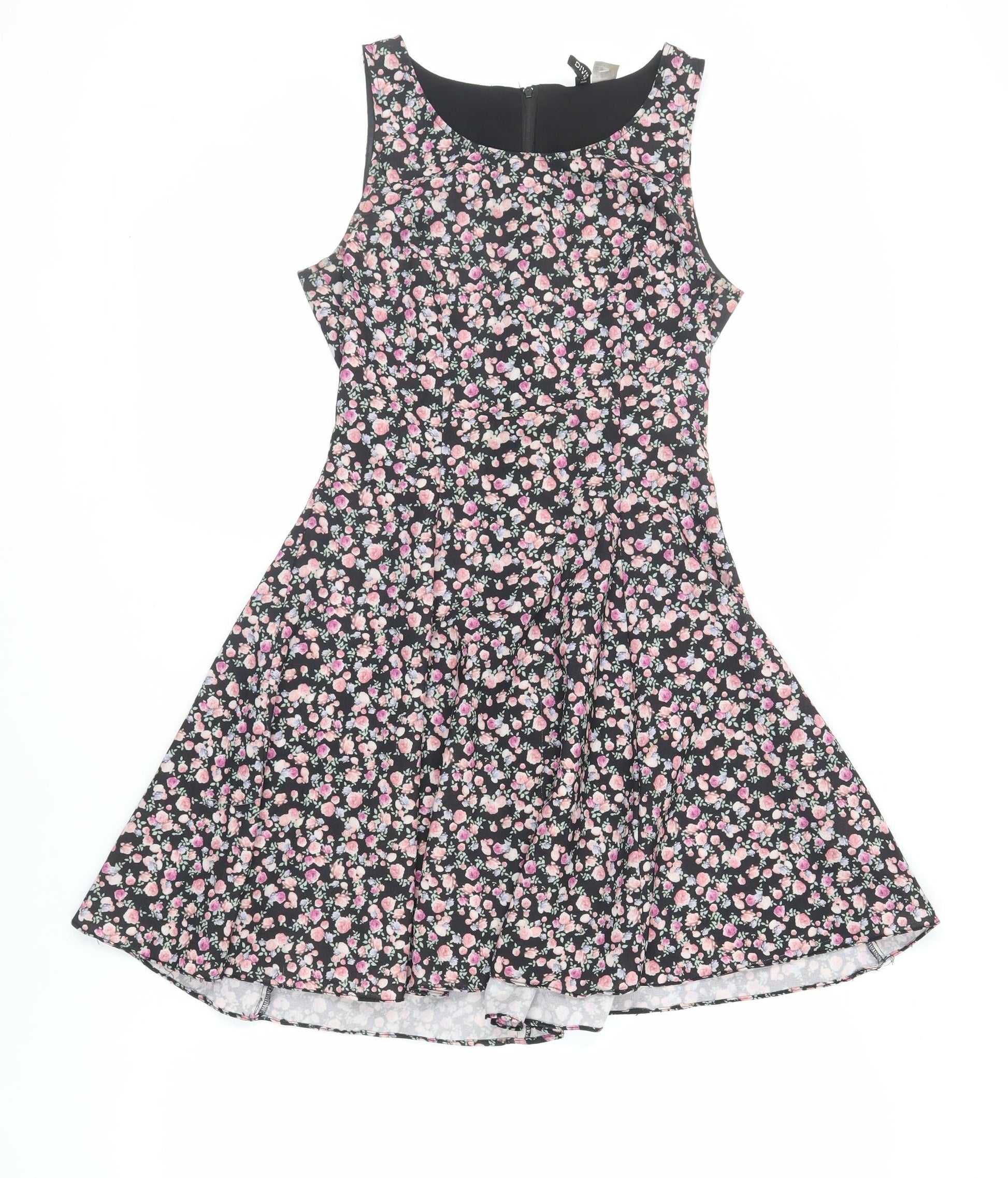 Divided by H&M Womens Black Floral Polyester Skater Dress Size 8 Round Neck Zip