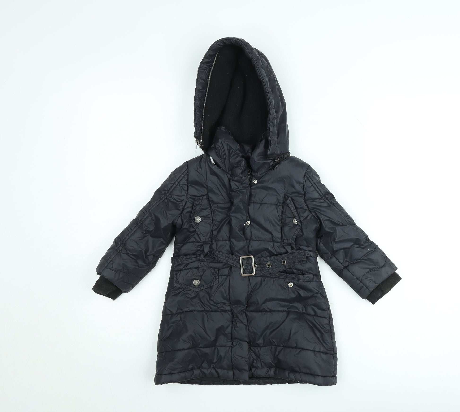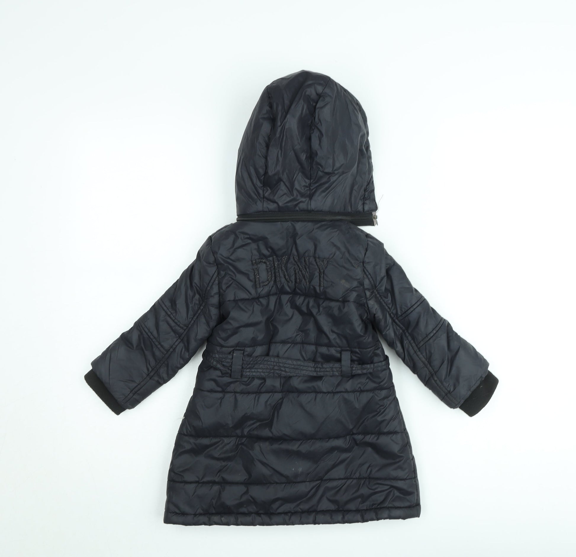 DKNY Girls Black Belted Hooded Long Puffer Coat Size 2 Years Winter Jacket