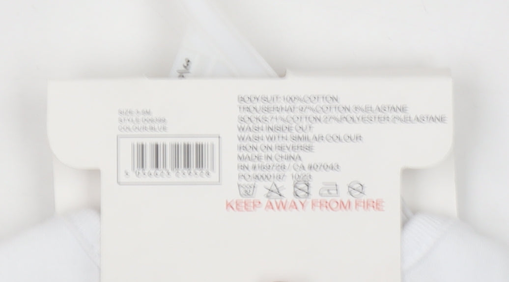 - Material Breakdown: Bodysuit: 100% Cotton Trousers/Hat: 97% Cotton 3% Elastane Socks: 74% Cotton 24% Polyester 2% Elastane