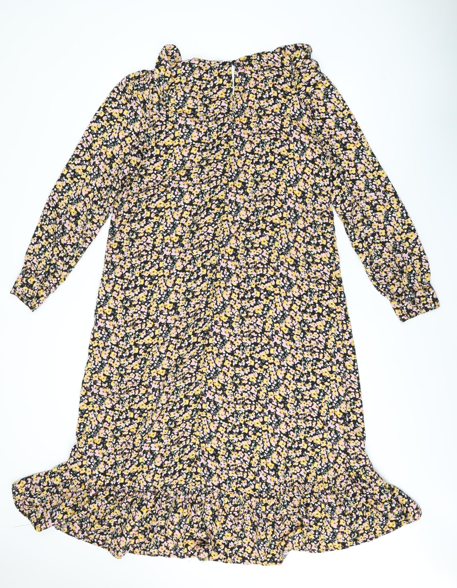 Dorothy Perkins Womens Black Floral Polyester Shift Size 14 Round Neck Button - Frill Detail