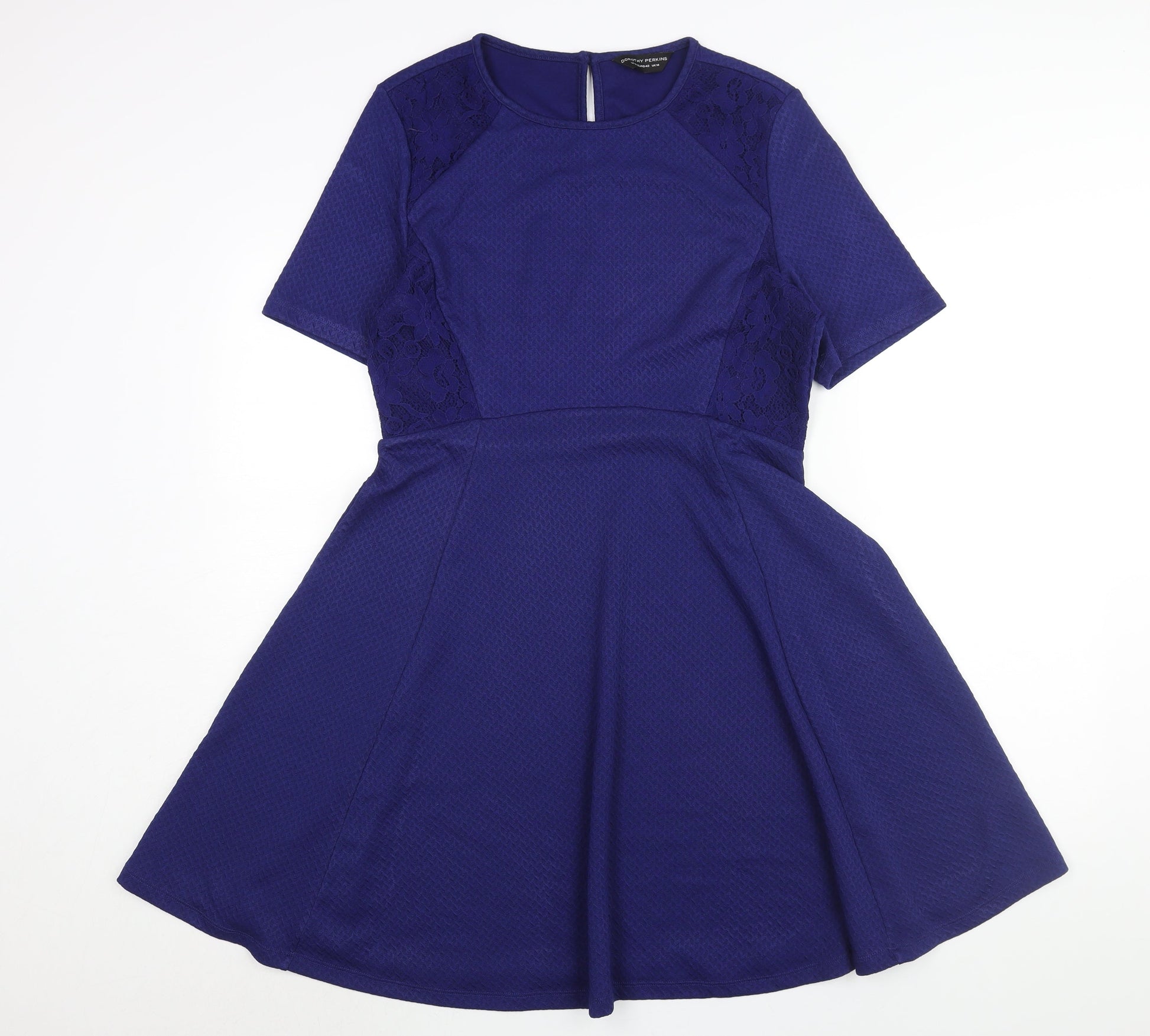 Dorothy Perkins Womens Blue Polyester Fit & Flare Size 14 Round Neck Button - Lace Detail