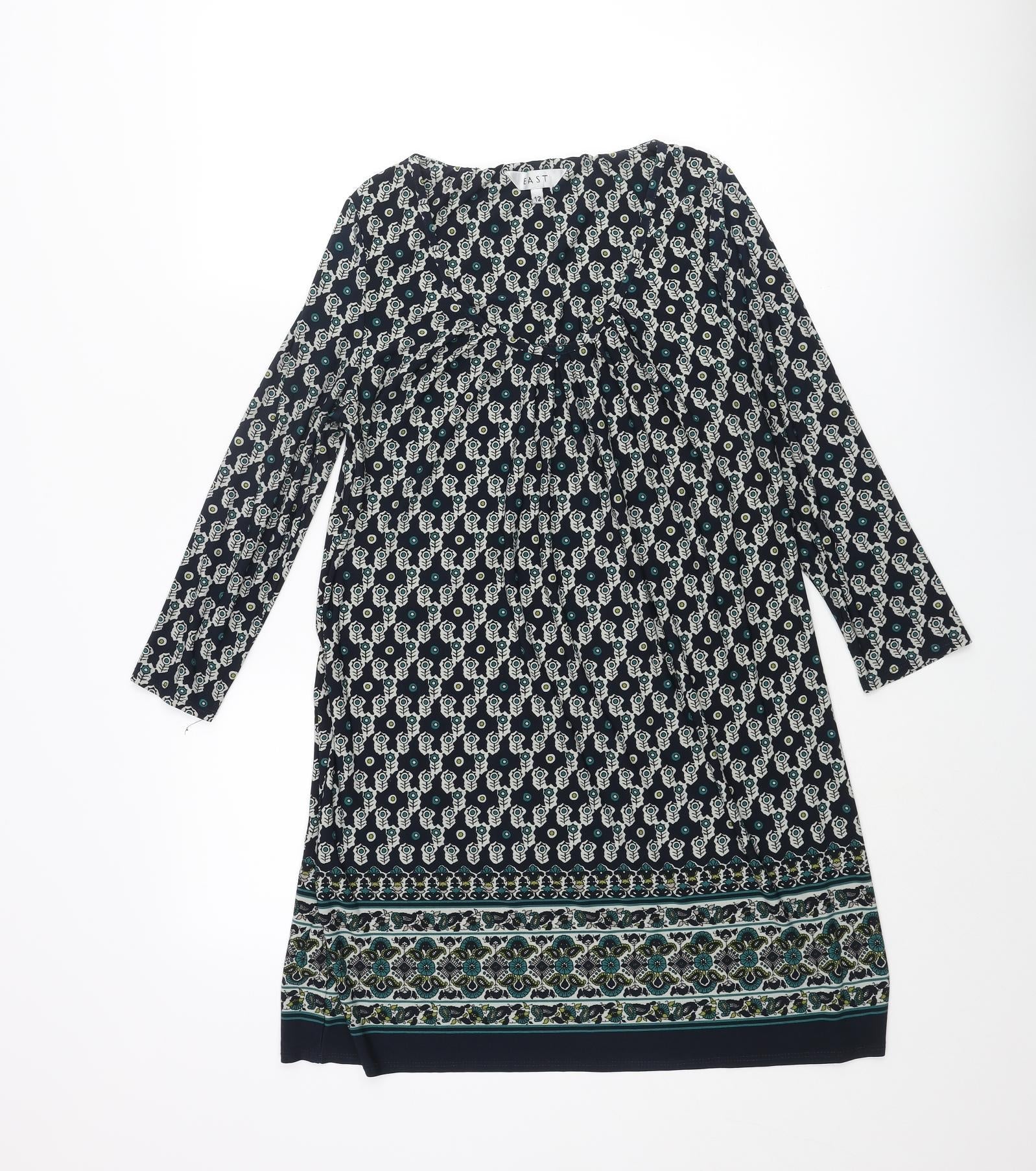 EAST Womens Blue Geometric Polyester Mini Size 12 Scoop Neck Pullover