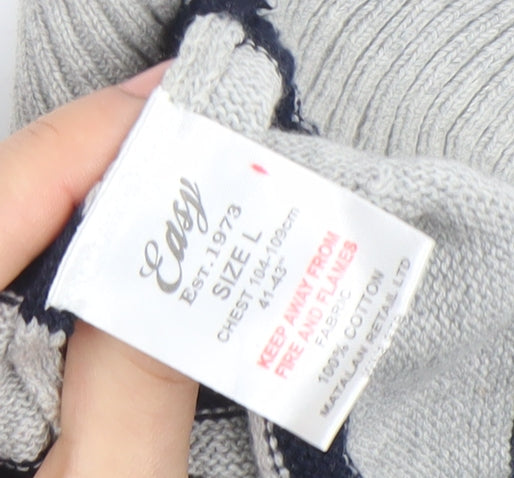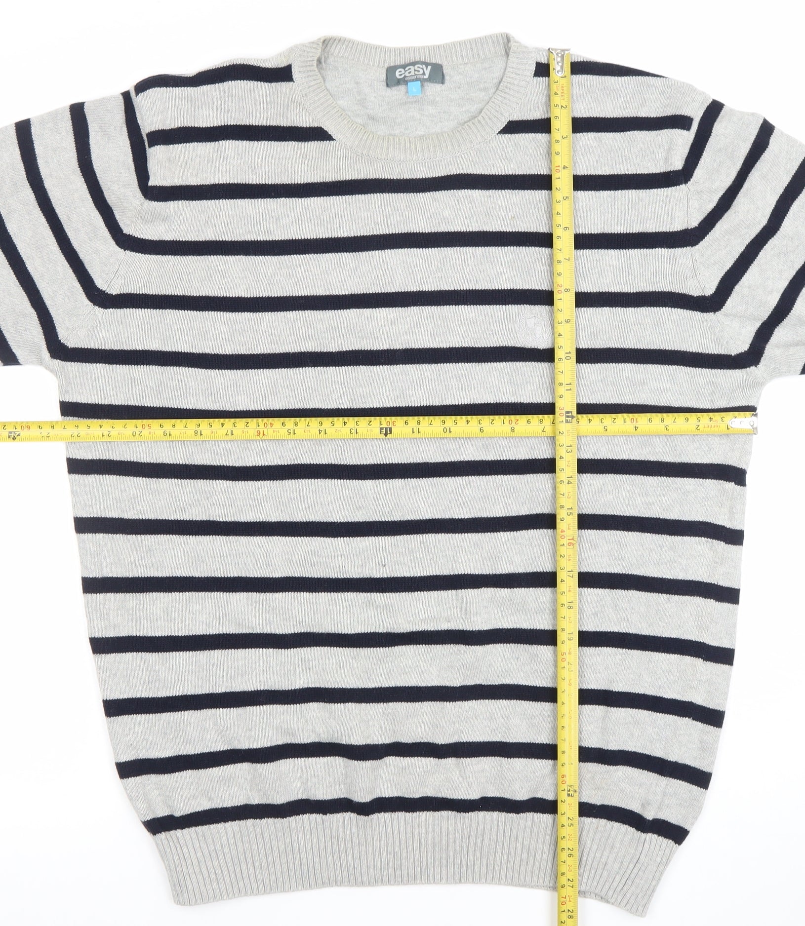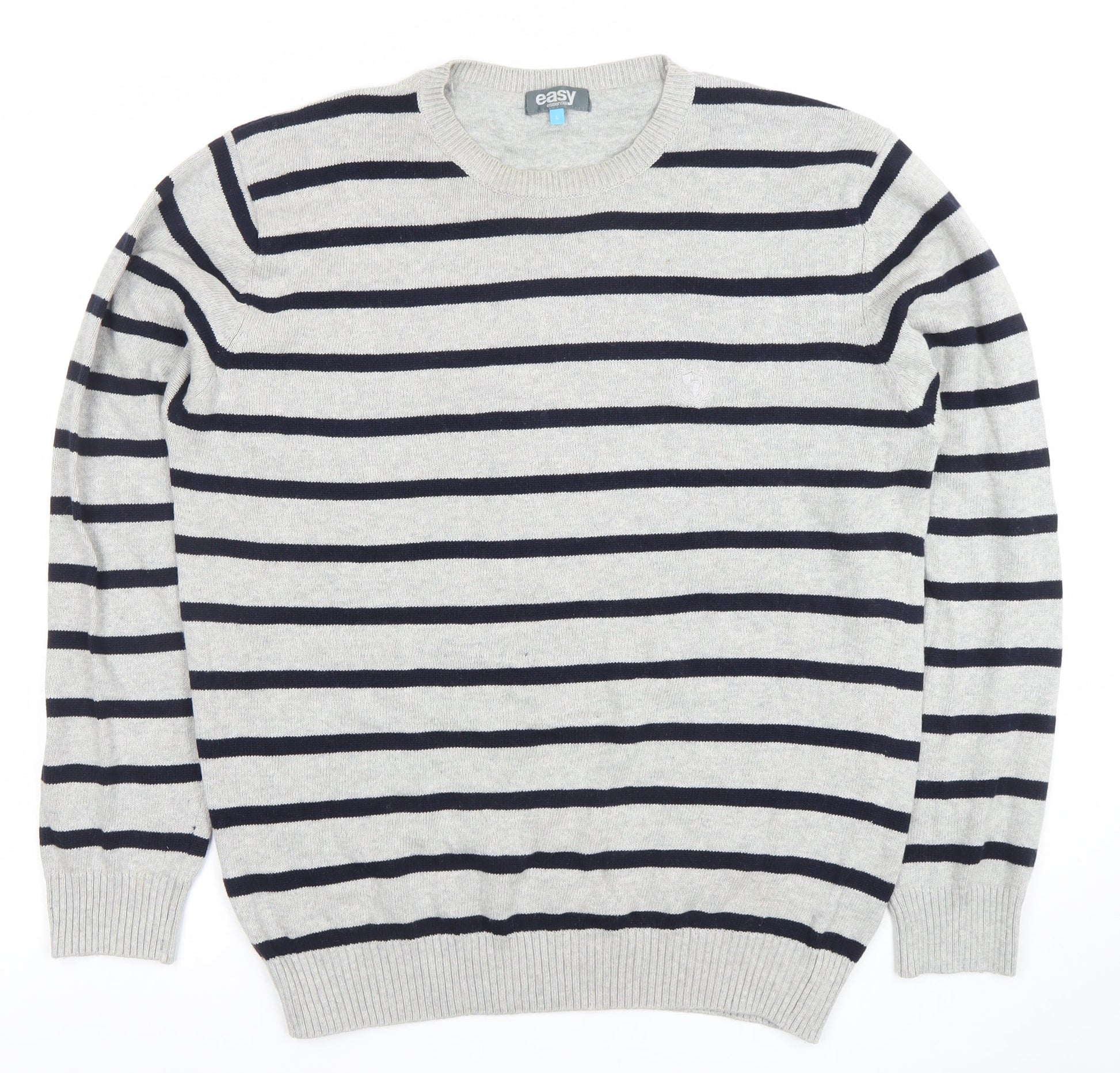 Easy Men's Grey Striped Cotton Crew Neck Jumper Size L