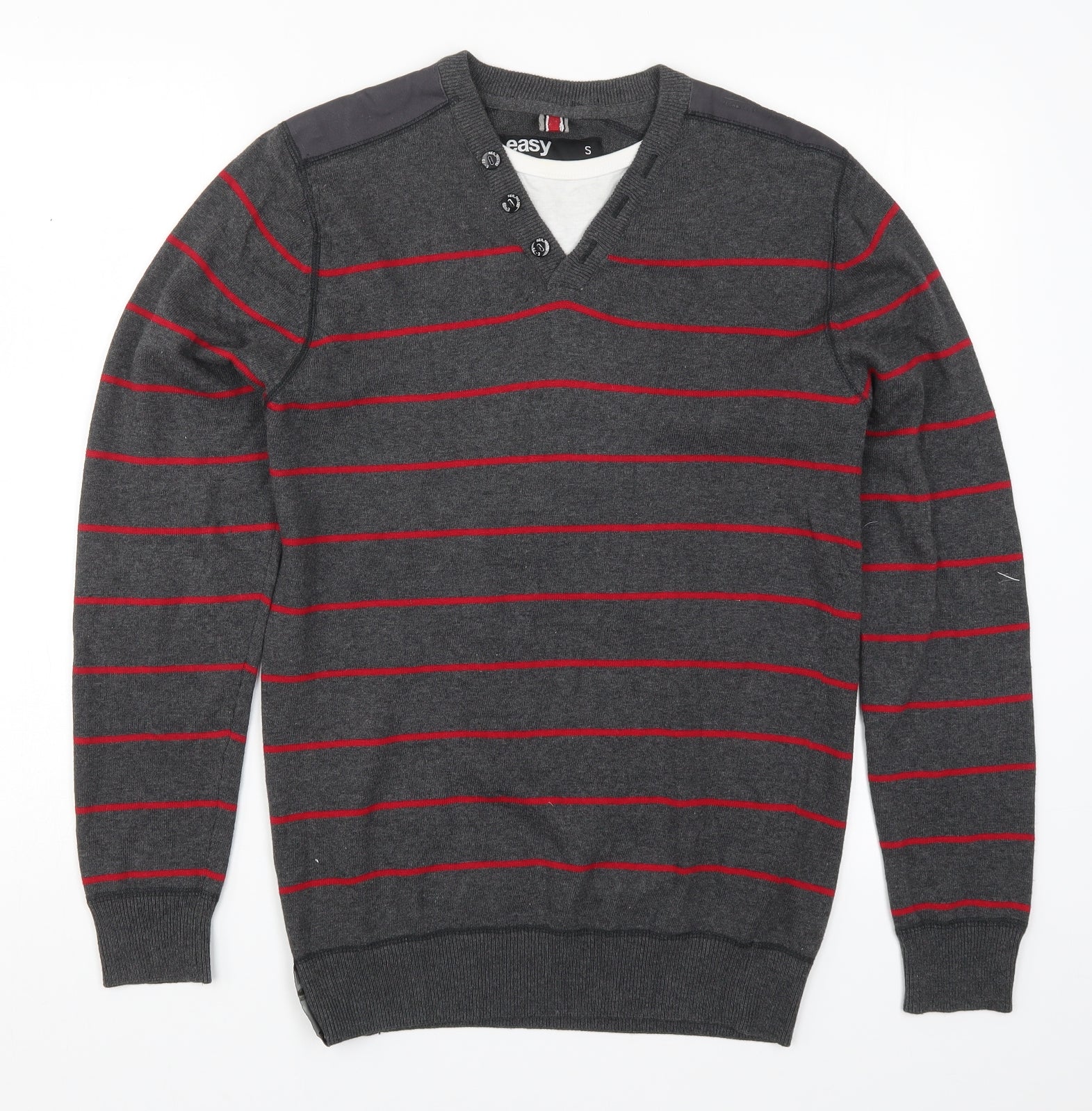 Easy Mens Grey Striped Knit Pullover Jumper Size S - Red